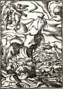 Der Meister IF (Jakob Faber bzw. Jacques Lefèvre, aktiv zwischen 1516 und 1550) schuf diesen Holzschnitt zur Apokalypse im Stil Lembergers, welcher in die Bibelausgabe „Testamenti Novi Editio Vulgata“ integriert wurde (S. 347). Herausgebracht wurde diese Ausgabe von Sebastian Gryphius in Lyon im Jahre 1542 (Neuauflage 1564). Hier sind die Figuren recht klein geraten; die Flügel des Engels erscheinen geradezu verkürzt. Einzelne Pflanzen erkennt man kaum, der abgeschlagene Baumstumpf ist weggelassen, es dominiert die Dynamik geschwungener Formen, Wolken und Fels vermengen sich zu einer fast schon abstrakten Einheit.