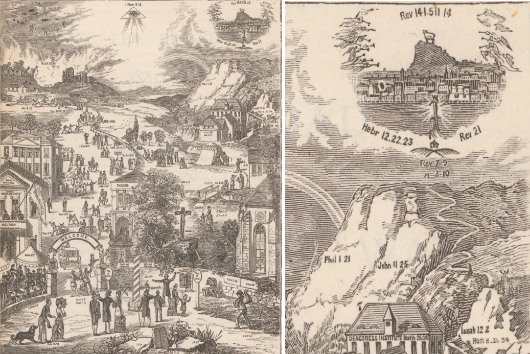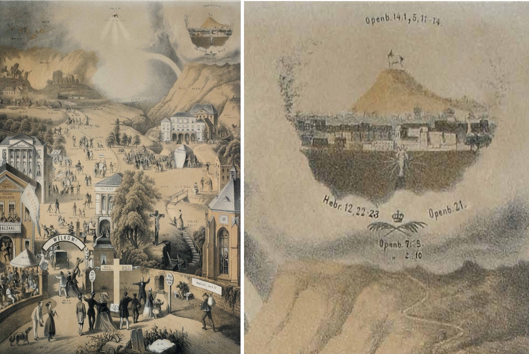 Das Himmlische Jerusalem hat hier, im Gegensatz zu anderen Zweiwegebildern, seine zentrale Position verloren und ist an den rechten Rand gerückt. Es hat übrigens fast die gleiche Höhe wie die Hölle, die sich unten rechts oder links befindet. Die Himmelsstadt ist recht klein und insgesamt schlecht zu erkennen. Aus den Wolken erhebt sich ein mächtiges, eher abweisendes Fundament, an dem eine kleine Öffnung ein einziges Tor markiert. Hinter der Mauer verlieren sich unendlich viele Häuser bis an den Horizont. Dort erhebt sich eine gewaltige Anhöhe, der Zionsberg. Auf diesem steht, von einem Strahlenkranz umgeben, das Gotteslamm. Bibelverweise um diese Zeichnung machen unmissverständlich klar, dass es sich um die Gottesstadt handelt. Darunter ist auf dem Weg dorthin, also als letztes Gebäude auf dem schmalen Weg, das Diakonissenhaus zu finden, welches Reihlen aufgebaut hat (hier verwendete Abbildung: Landeskirchliche Archiv Stuttgart, Inventarnummer 07.028).