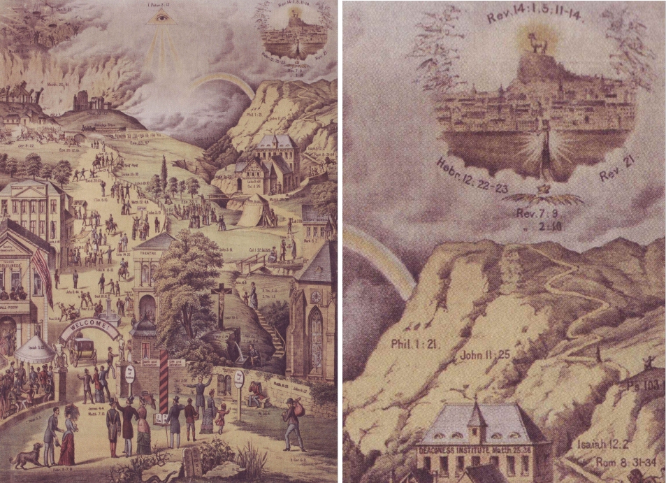 Eine erste wesentliche Neuinterpretation entstand 1887 in den USA. Man tauschte die bisherigen Bildelemente durch solche aus der Welt des Freimaurertums aus, schon der Titel deutete an, dass hier an Selbsterlösung gedacht war: „From Darkness to Light“. In der Symbolik sind Verweise auf den York-Ritus und den Schottischen Ritus enthalten. Von dem 122 x 92 Zentimeter großen Blatt interessiert hier lediglich der obere Abschluss. Dort erreichen Menschen nicht nur einen Berggipfel, sondern auch die erscheinende Stadt in Form eines gewaltigen Tempelbaus. Damit wird auch an den Tempel Salomon erinnert, der innerhalb des Freimaurertums eine konstituierende Bedeutung hat. Zurück geht diese Darstellungsform im Prinzip auf Juan Bautista Villalpando. In den USA wurden sie durch John Sherer (gest. 1875) weiterentwickelt, einem Tempelforscher, Freimaurer und Verleger aus Cincinnati (Ohio). Nicht zufällig war der Auftraggeber von „From Darkness to Light“ der Orden „Odd Fellows Lodge“, und in diesem Kreis wird auch die Bildkonzeption entstanden sein. Diese Loge hatte in Cincinnati ihren ersten Tempel errichtet, zu dessen Ausgestaltung dieser Druck gedacht war. Die ungewöhnliche Arbeit wurde dann 1887 und erneut 1888 von „The Pettibone Bros. Mfg. Co.“ in Cincinnati gedruckt. Diese Firma war durch den Bau von Eisenbahnen emporgekommen, stellte neben Lokomotiven und Traktoren auch unterschiedlichste andere Produkte her, wie auch Poster und Bücher. Eines der Exemplare wird heute in der Library of Congress aufbewahrt (Nr. 2018696022).