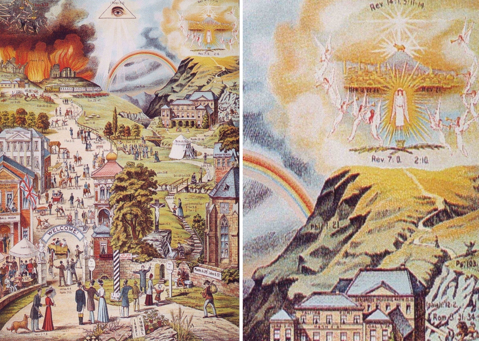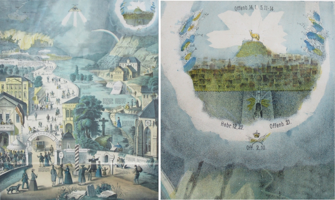 Diese Fassung von „Der breite und der schmale Weg“ erschien als kolorierte Kreidelithographie 1873 (Landeskirchliche Archiv Stuttgart, Inventarnummer 3.006). Sie wurde über einen längeren Zeitraum vertrieben und immer wieder neu aufgelegt. Bezüglich des Himmlischen Jerusalem scheint sich nichts geändert zu haben. Eine Kleinigkeit findet der aufmerksame Betrachter dann doch: Bislang gingen allein von der Engelsfigur über dem Haupttor Strahlen aus, kaum sichtbar, aber vorhanden. Nun auf einmal hat auch das Lamm auf dem Zionsberg Strahlen bekommen.