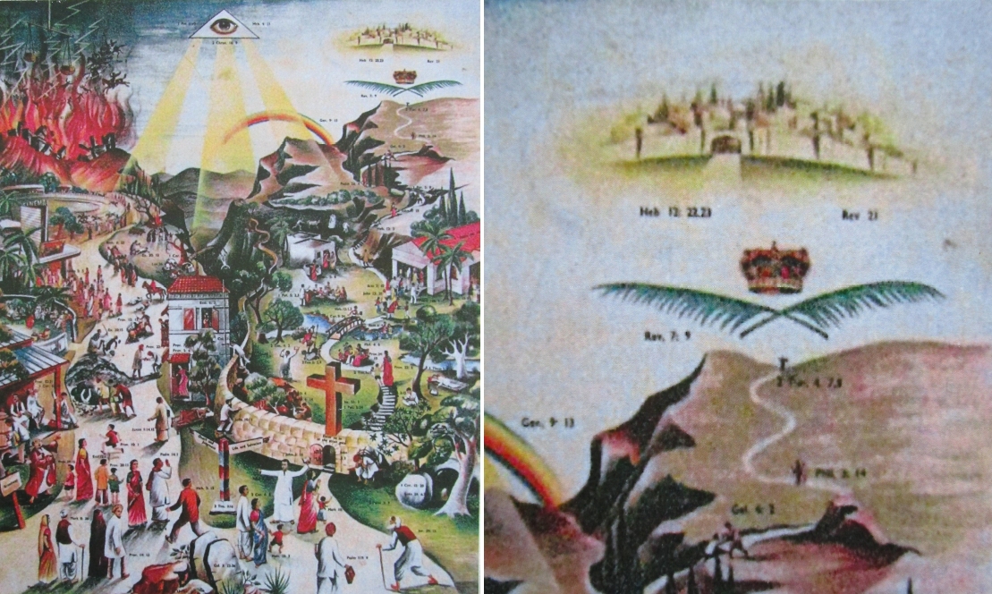 Das Zweiwege-Motiv „The broad and narrow way“ wurde auch einmal auf indische Verhältnisse übertragen. Entstanden ist die Grafik vermutlich in London und wurde dann von anglikanischen Missionaren in den 1970er Jahren in Indien verbreitet, wo man es noch heute in protestantischen Kreisen finden kann. Bei diesem Ausschnitt handelt es sich um eine Fotografie eines Plakates, das sich einst in Südindien befand (heute Landeskirchliche Archiv Stuttgart, Inventarnummer 18.077. Menschen in weißen Gewändern und Turbanen, Kobraschlangen oder Palmen sollen einen indisches Kolorit erzeugen. Auch das Himmlische Jerusalem wurde komplett überarbeitet: Die Engel und das Lamm wurden gestrichen. Über einem grünen Bogen erheben sich die Stadtmauern mit einem Haupttor, hinter dem Bauten und immer wieder Bäume zu finden sind. Eine Besonderheit darunter, die nicht allen gefallen haben dürfte: Die Krone der Märtyrer ist hier von der englischen Königskrone inspiriert.