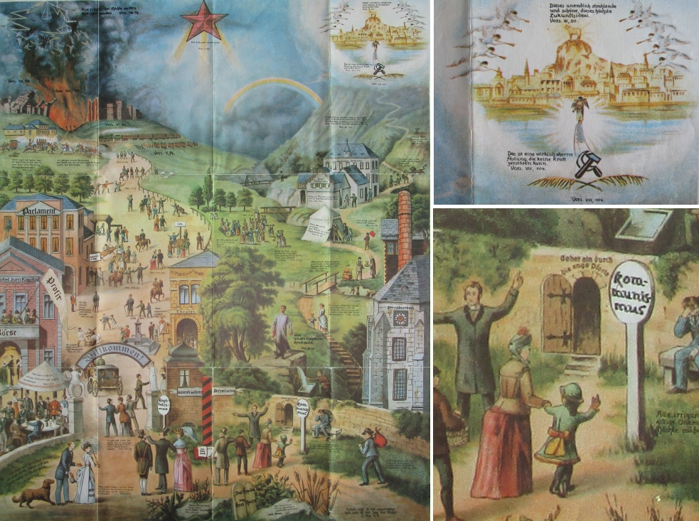 Die „Lahr-Dinglinger-Fassung“ wurde im Kontext der 1968er-Bewegung auch einmal marxistisch umgedeutet. Die „schmale Pforte“ wird zum Eingangstor zum real existierenden Sozialismus, bzw. zum Kommunismus, wie es das Schild verheißt. Weiter oben erscheint in der Ecke rechts eine Art „Anti-Neues-Jerusalem“: die moderne Stadt ist ein Sündenbabel, statt dem Gotteslamm thront das goldene Kalb über allem, auch über Hammer und Sichel. Die einzelnen Stationen sind mit ironischen Sprüchen versehen, so steht über der Stadt: „Dieses unendlich strahlende und schöne, dieses höchste Zukunftsideal“. Das Blatt findet man als Beilage Nr. 25 („Kursbogen“ genannt) zur Oktoberausgabe 1971 des „Kursbuches“, welches damals von Hans Magnus Enzensberger herausgegeben wurde. Wer damals die graphische Bearbeitung vorgenommen hat, ließ sich nicht mehr herausfinden (hier abgebildete Details: Landeskirchliche Archiv Stuttgart, Inventarnummer 96.061).