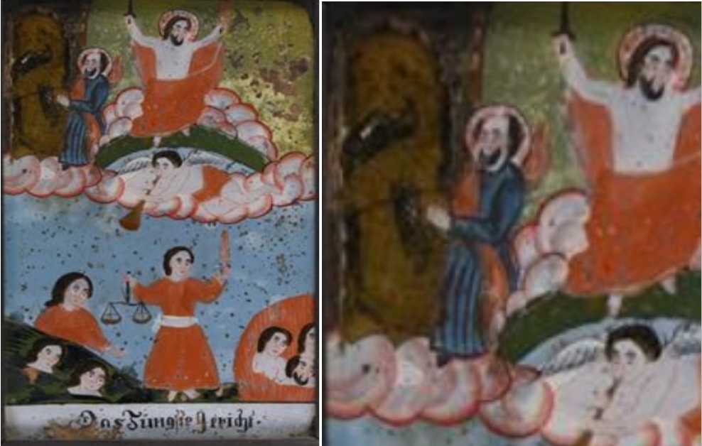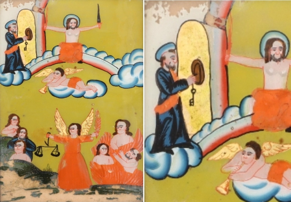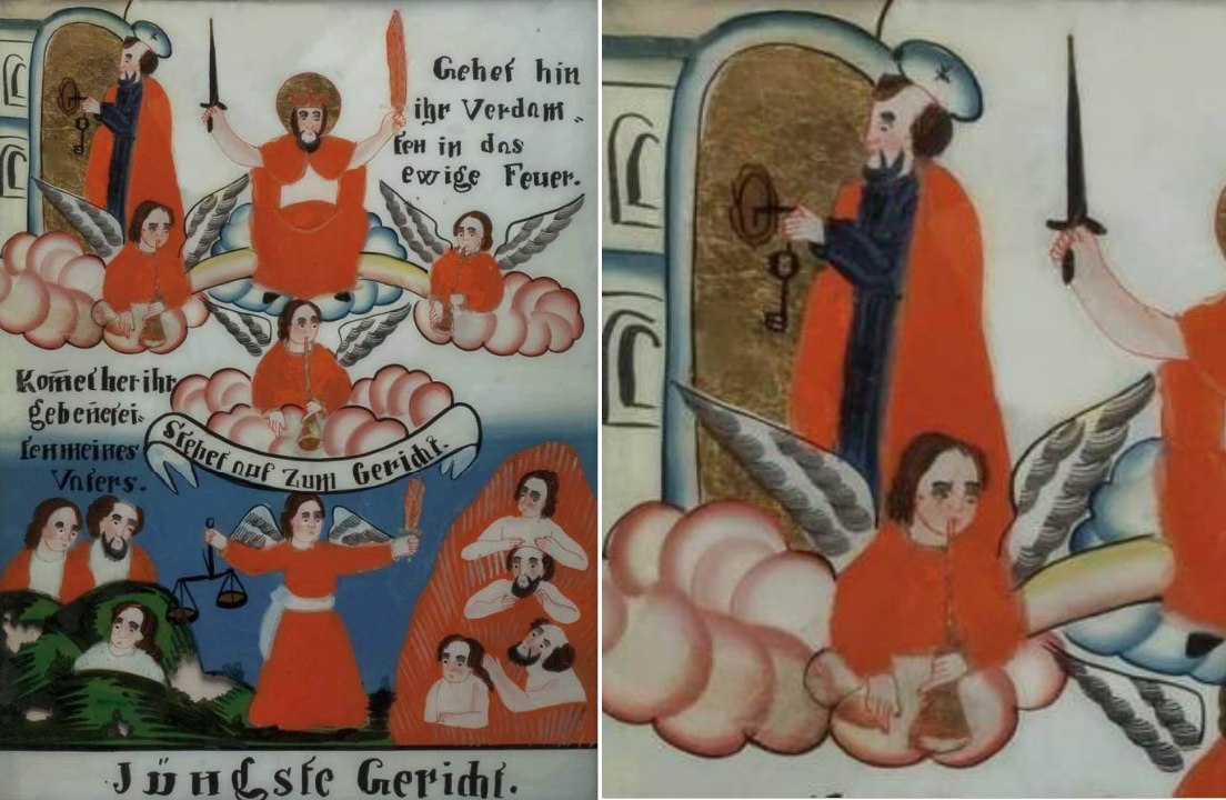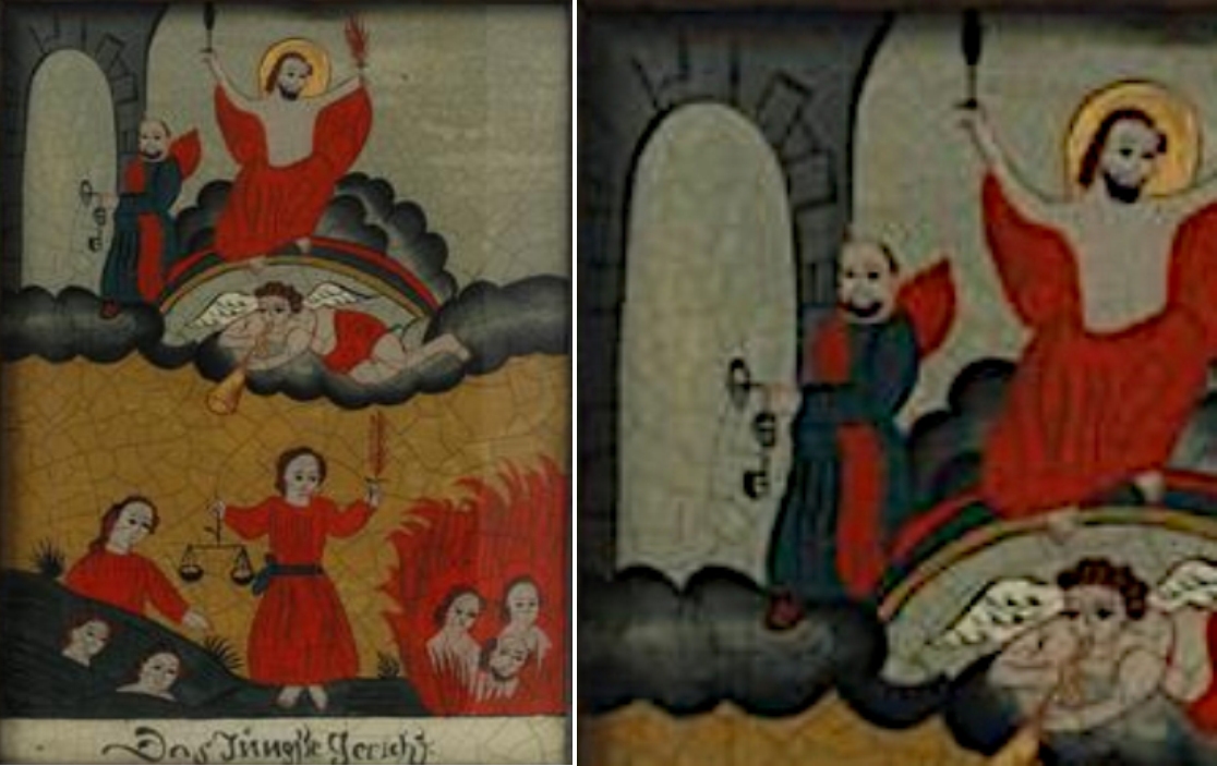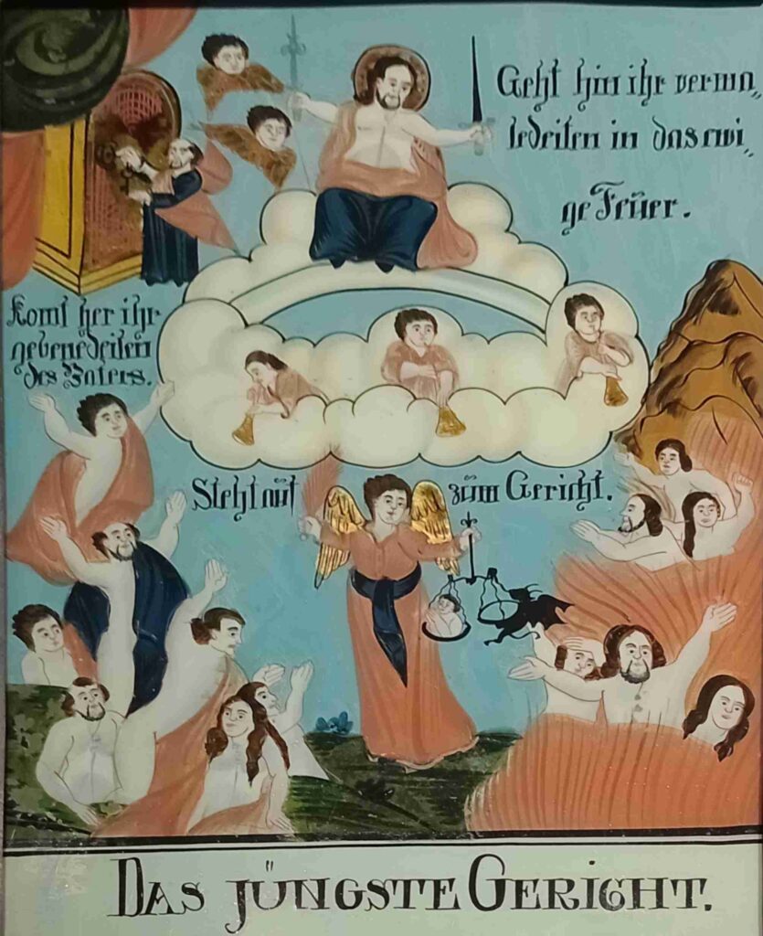Gleichzeitig wurde diese Hinterglasmalerei (1850-1900) im Online-Kunsthandel angeboten. Der Hintergrund eines 28 x 38 Zentimeter großen Weltgerichts, hier im satten Gelb, konnte ganz verschiedene Farben haben, hier gab es keine Tradition oder theologische Präferenz. Die hiesige Fassung ist detailreich und gekonnt ausgeführt, das zeigen die Proportionen und der Ausdruck der Figuren. Eine ähnliche Fassung, leider beschädigt, befindet sich im Besitz des Nationalmuseums von Slowenien (Hintergrund ebenfalls gelb, Türfüllung türkisfarben).