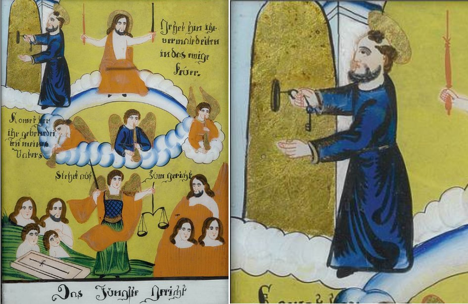 Eine der ältesten erhaltenen Hinterglasmalereien stammt aus Buchers. Der Ort befindet sich in Tschechien und liegt im Gratzener Bergland direkt an der Grenze zu Österreich. Einst war er ein Zentrum der Glaskunst, und um 1810 ist dort diese 47 x 36 Zentimeter kleine Malerei entstanden. Thema ist das Jüngste Gericht mit Christus als Richter in der Mitte. An seiner rechten Seite (für den Betrachter die linke Seite) ist das Neue Jerusalem dargestellt, in Form einer Himmelspforte. Für eine Hinterglasmalerei ist diese frühe Darstellung detailreich, man erkennt die Struktur der Türaußenseite und den Schlüssel, mit dem sie gerade von Petrus geöffnet wird. Interessanterweise ist Petrus nicht allein mit zwei roten Flügeln ausgestattet, er hat auch zwei Schlüssel dabei. Überhaupt hatte der Maler oder die Malerin eine Tendenz zu Verdoppelungen: Deutlich sieht man auf dem Ausschnitt, dass Christus in beiden Händen ähnliche Gegenstände nach oben hält; offensichtlich zwei schmiedeeiserne Schwerter. Auch bei den Flügel ist man durcheinander gekommen: So bekam Petrus hier nicht zwei Engelsflügel, sondern irrtümlich Fledermausflügel, mit denen eigentlich Dämonen oder Teufel ausgestattet wurden. Überhaupt sieht der Himmelspförtner mit dem Dreitagesbart wenig vertrauenerweckend aus. Das Werk war Teil der Kunstsammlung von Udo Dammert (1904-2003), der es 1992 auf einer Auktion in Prag erwerben konnte. Die Pretiose wird heute im Schlossmuseum Murnau (Inventarnummer 4286) aufbewahrt. Eine spätere Kopie dieser Fassung wurde um 2023 beim Auktionshaus Dorotheum in Wien versteigert (Bild vorhanden).
