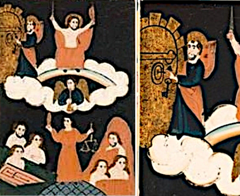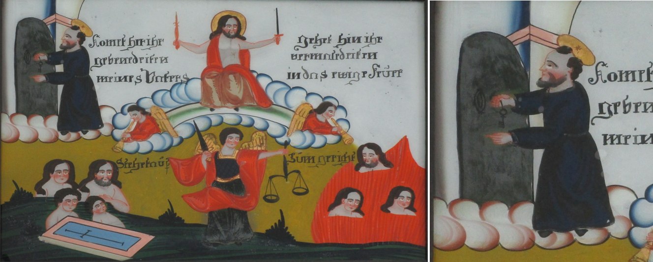 Eine ähnliche Fassung gleicher Zeit stammt aus Oberösterreich. Heute in einer Privatsammlung, stand sie im Jahr 2014 zum Verkauf an. Überhaupt waren in der Zeit 2013/14 außergewöhnlich viele Hinterglasmalereien auf dem Kunstmarkt. Hier hat die goldene Pforte vor schwarzem Hintergrund eine rustikale Rahmung. Petrus rechts hat übrigens wieder seine roten Flügel, die man schon bei älteren Hinterglasmalereien finden kann.