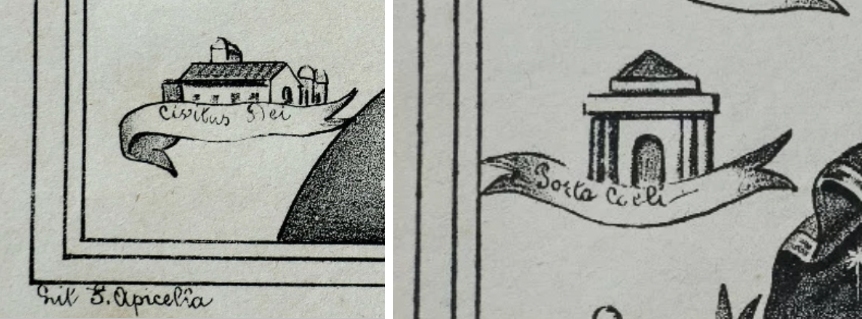 Um 1890 wurde in Süditalien eine Lithographie (Fassung A) im alten Stil des Barock um 1680 vertrieben. Das lediglich 19 x 14 Zentimeter kleine Blättchen zeigt eine Marienfigur, umgeben von ihren Symbolen. Dieser Bildtypus mit dem Namen „Maria Immaculata-Darstellung“ ist vor allem im 17. Jahrhundert populär geworden. Unter den weit über einhundert Mariensymbolen bildete sich damals auch ein Kanon heraus, welche ihrer Symbole bildlich immer wieder aufgegriffen wurden, wie die mystische Rose, das Goldene Haus, die weiße Lilie usw. Objekte, die in diesem Kanon auch das Himmlische Jerusalem repräsentierten, waren die Stadt Gottes, die geschlossene und die geöffnete Pforte.