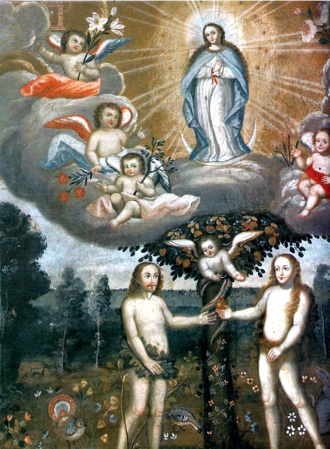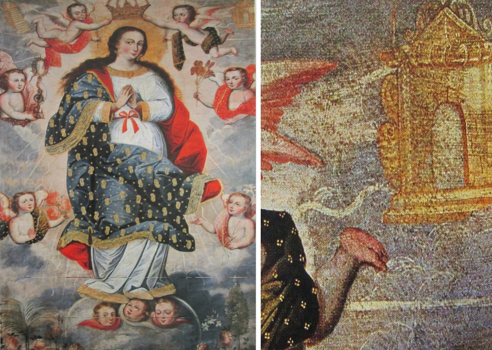 Marcos Zapata (um 1710-1773), auch Marcos Sapaca Inca genannt, war einer der letzten Vertreter der Cusco-Malerschule, in welcher spanische Maler Eingeborene unterrichtet hatten, die sich zuvor natürlich zum Christentum bekehren mussten. Von Zapata stammen Hunderte von sakralen Gemälden, auch zahlreiche Mariendarstellungen. Diejenige, um die es hier geht, hat den Titel „Paraiso terrenal: La Mujer del Protoevangelio“ (zu Deutsch: Irdisches Paradies: Die Frau des Protoevangeliums“. Es zeigt im unteren Teil Adam und Eva vor dem Paradiesbaum. Darüber erscheint eine Marienfigur mit einigen für sie typischen Attributen, die ihre Reinheit symbolisieren sollen. Ganz oben ist der Dreiecksgiebel der Pforte vom Bildrand leider beschnitten und links ist ein Pfeiler von einer graublauen Wolke verdeckt. Dennoch kann man die Umrisse eines filigranen Himmelstores erkennen. Es ist mit einem dünnen Pinsel in einer rosanen Farbe auf goldbraunem Untergrund lediglich skizziert. In seiner Mitte erscheint ein merkwürdiger Stern oder eine Blume – ein Objekt, das noch nicht befriedigend gedeutet ist. Genau so einen Stern mit Schweif findet man auch auf einer Himmelspforte aus dem Kloster Santa Catalina (Peru, 18. Jahrhundert) und auf einer Himmelspforte eines Gemäldes der Sammlung Joaquin Gandarillas Infante (Chile, 18. Jahrhundert), dieses Motiv scheint also vor allem in Neuspanien im 18. Jahrhundert verbreiterter gewesen zu sein. Gelegentlich wird in der Pforte eine menschliche Seele als kleines Kind eingezeichnet, doch hier scheint es etwas anderes zu sein.