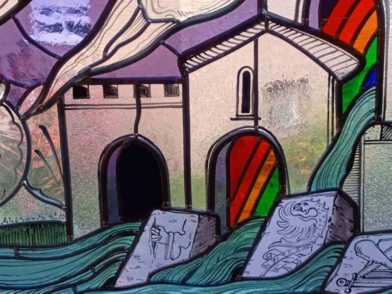 Links ist die Pforte geschlossen, rechts steht sie am Ende einer bühnenhaften Treppe. Beide Symbole sind komplett mit Gold aufgezeichnet, aber äußerst fein und fast transparent, wie damals auch bei Pforten von Andrés Lagarto oder Baltasar de Echave Ibía. Ganz unten, rechts, ist eine Civitas Dei wiedergegeben. Hinter einer Mauer fallen vor allem ein Kuppel- und ein Turmbau ins Auge. Entstanden ist diese Ölmalerei um 1630.
