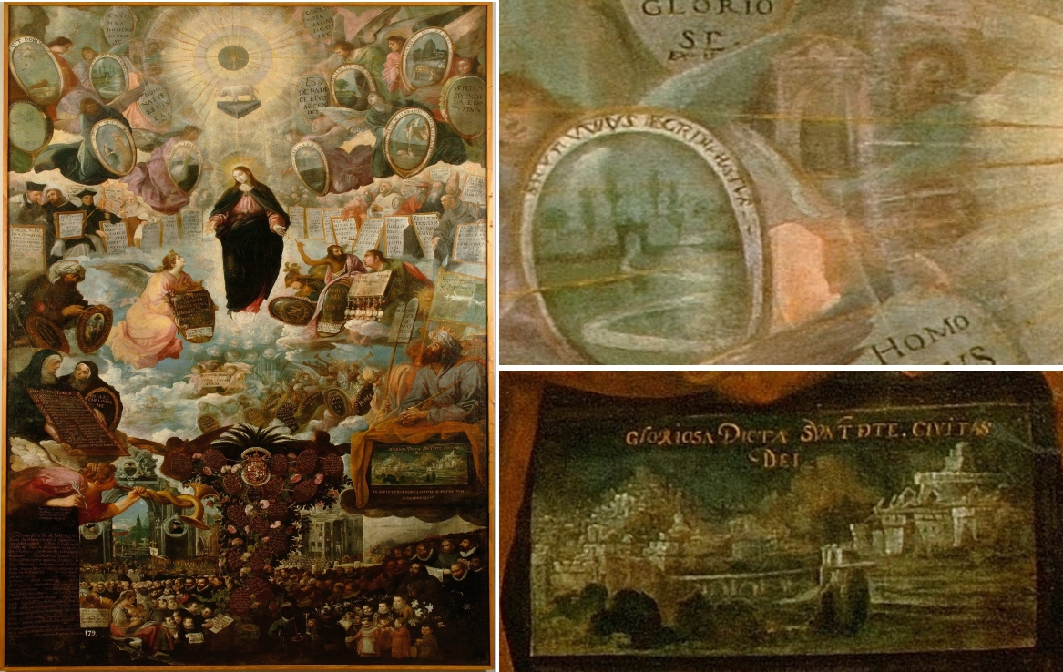 Im unteren Teil des Bildes rechts ist die Civitas Dei gesetzt. Als eines der wenigen Symbole ist es als solches auch schriftlich bezeichnet. Hier kommt die naturalistische Darstellungsweise von Roelas zum Zug: Die Stadt ist nicht etwa als Neues Jerusalem mit seinen typischen Merkmalen wie Engel, Mauern, Edelsteine dargestellt, sondern wie eine Stadt des 17. Jahrhunderts. Sie liegt mit einer größeren Festung an einem Fluss, über den eine Brücke führt. Die Stadt Rom mit ihren Hügeln, der Tiberbrücke und der Engelsburg gab hierzu Anregung.