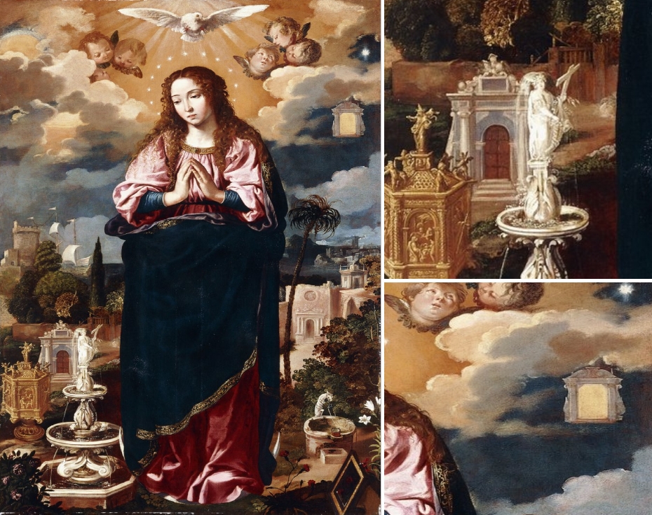 Neben unzähligen Details sind auf dem Gemälde auch Mariensymbole zu finden. Die geöffnete klassizistische Pforte mit einem Dreiecksgiebel ist schwer zu sehen, man findet sie an der linken oberen Seite des Bildes. Sie steht dort als Himmelspforte rechts von der Paradiespforte (die in ein Medaillon gesetzt ist), getragen von einem Putto. In dem Medaillon befindet sich übrigens eine zweite Pforte, zu der ein gewundener Weg führt.