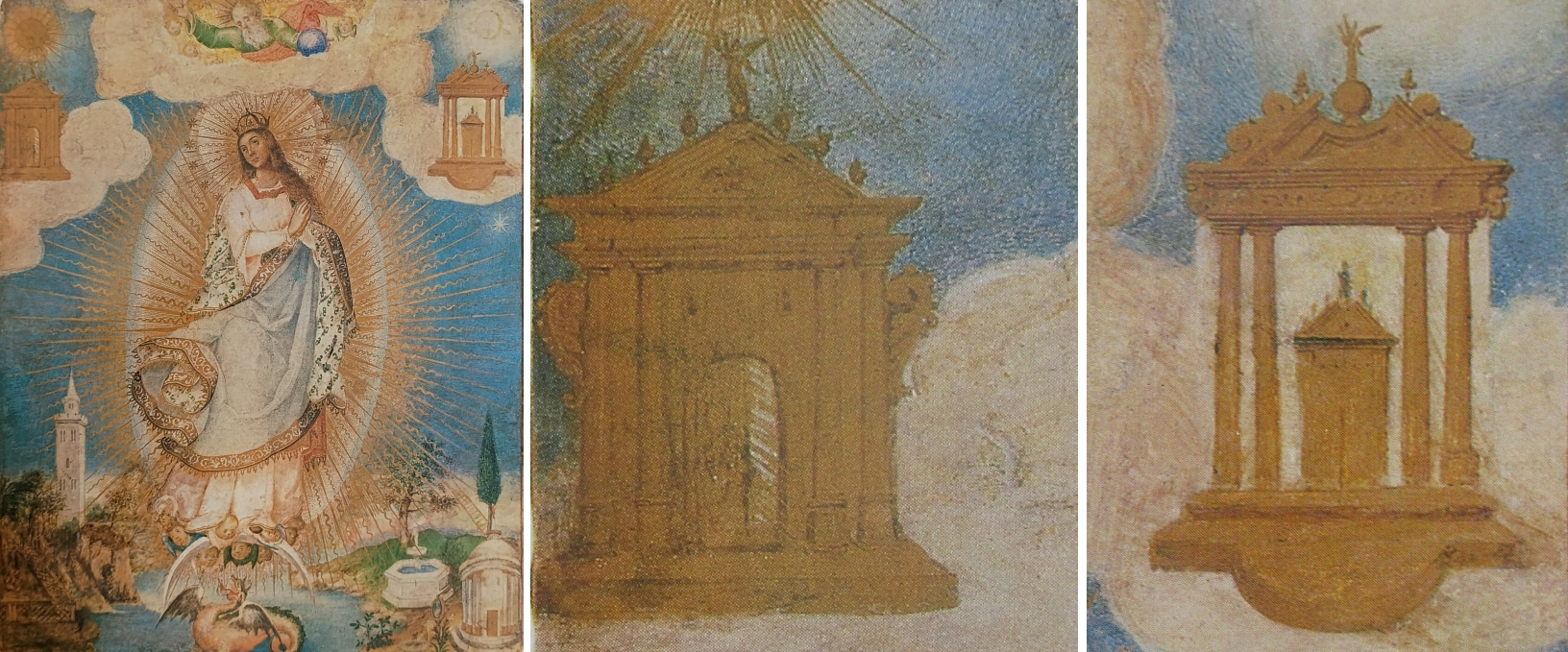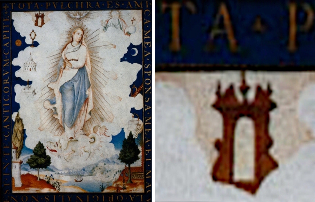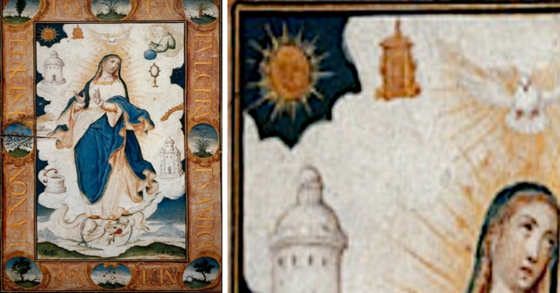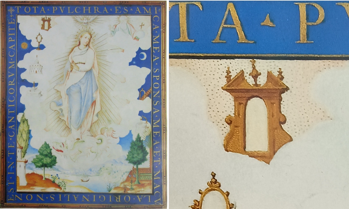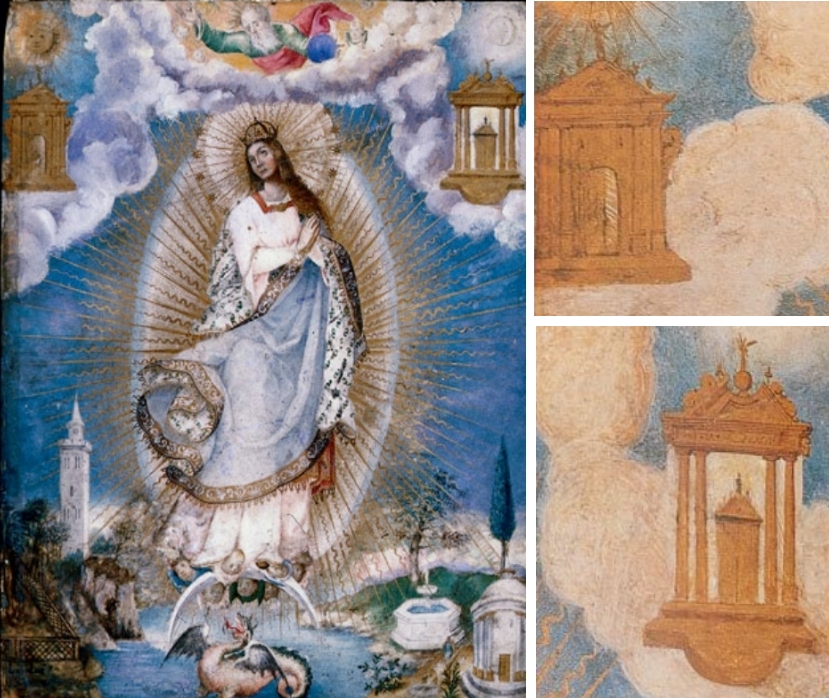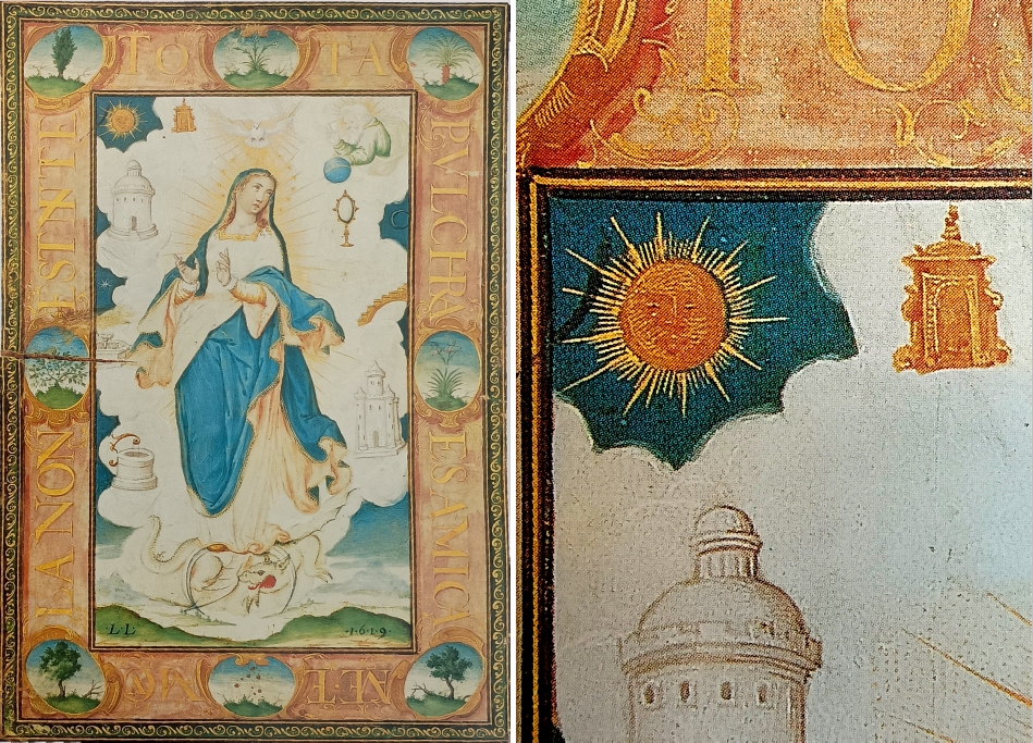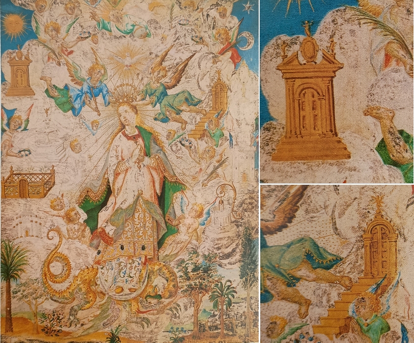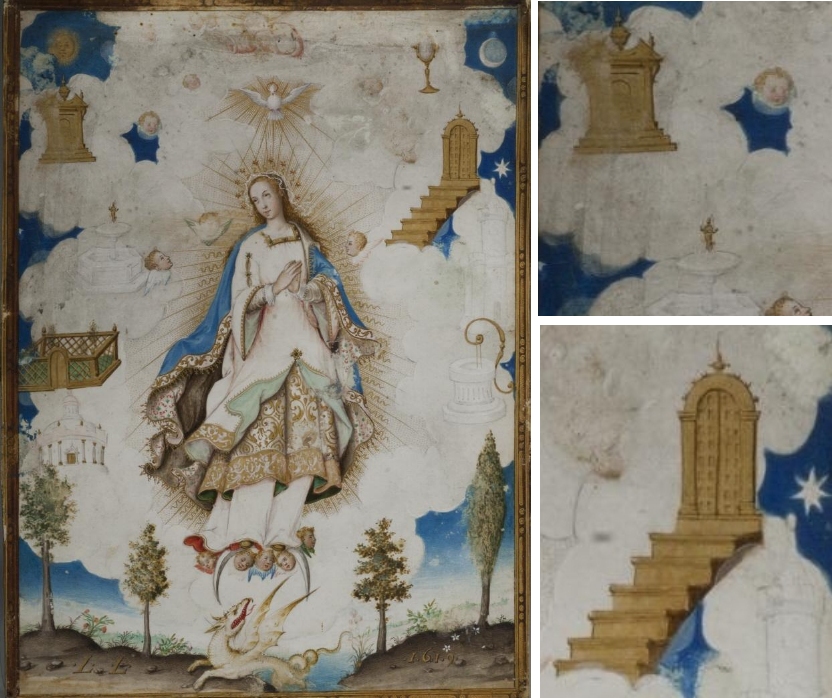 Eine weitere Doppeltorfassung präsentiert diese Immaculata-Darstellung, die um 1620 entstand und Luis Lagarto zugeschrieben wird. Auch hier haben wir eine Malerei, die sich heute in einer Privatsammlung findet. Der Meister übertrifft sich selbst: Beide Symbole neben der zentralen Marienfigur sind vergoldet und überaus reichlich ornamentiert. Besonders die rechte Pforte ist ein bemerkenswertes Fantasieprodukt, denn der Meister hat in die Pforte, die übrigens auf Doppelsäulen steht, eine zweite Pforte eingesetzt. Somit haben wir hier eine Pforte, die gleichzeitig offen und geschlossen ist – auf solche Einfälle muss man erst einmal kommen.