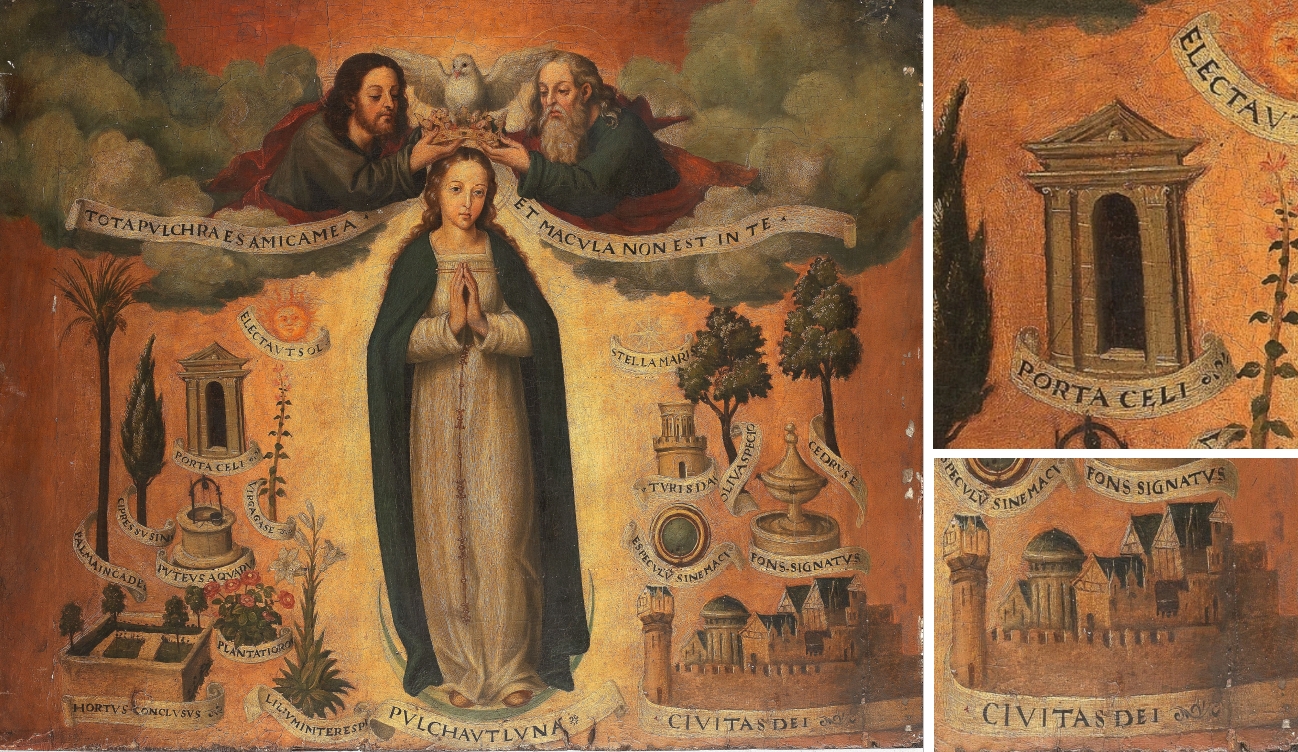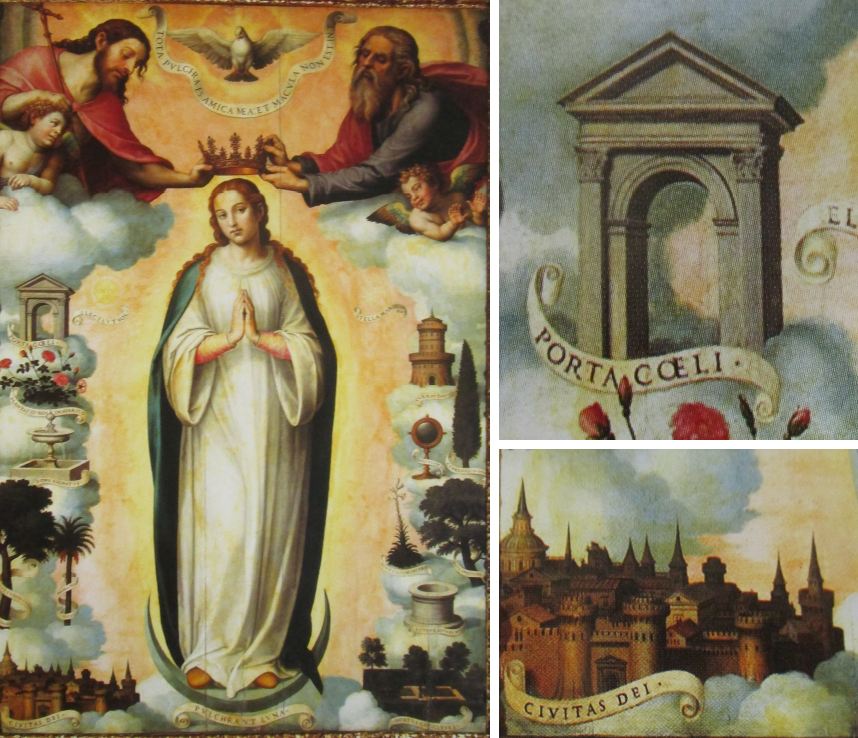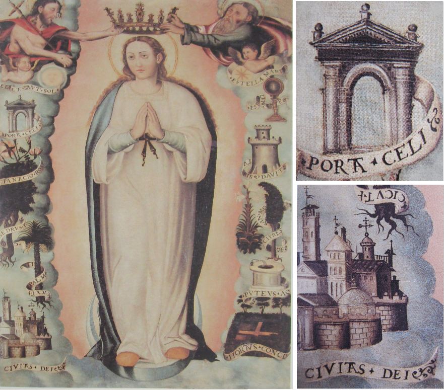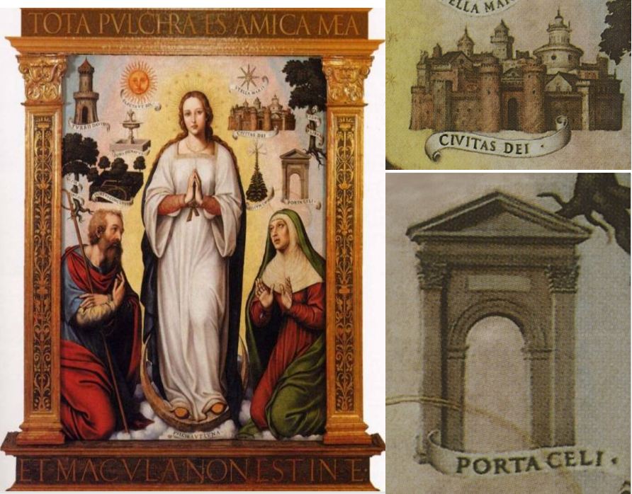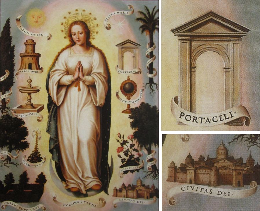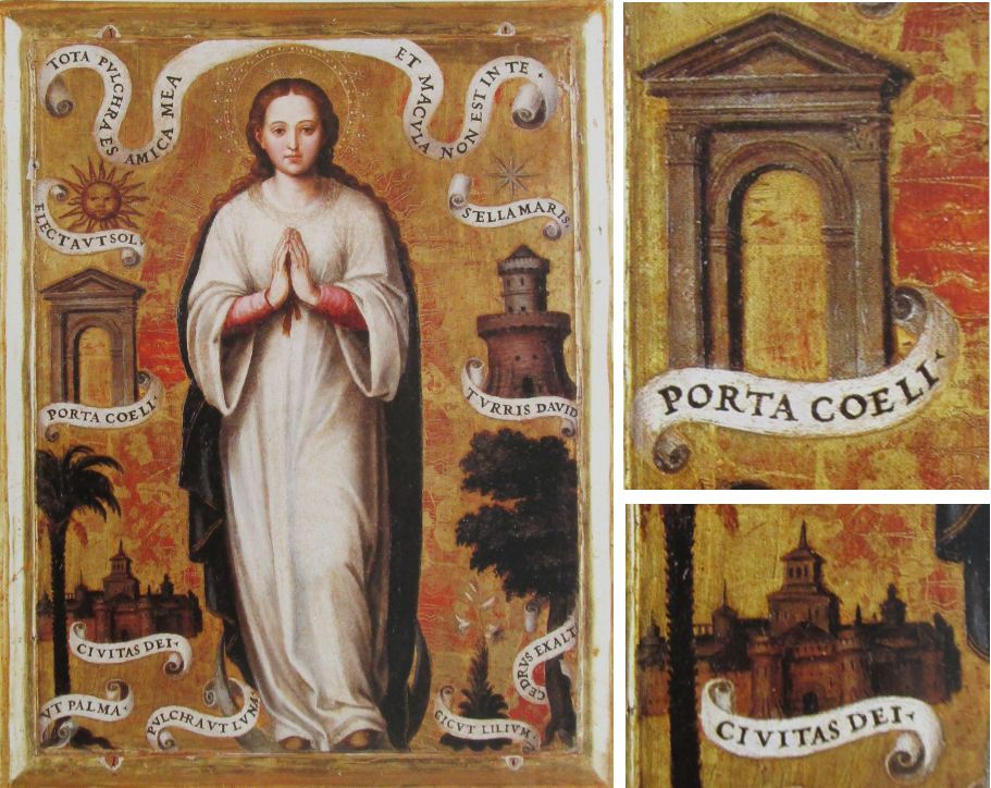 Der spanische Maler Joan de Joanes (Juan de Juanes, auch Vicente Joannes Macip, 1507-1579) war in Spanien im 16. Jahrhundert unbestritten der Meister der Immaculata-Darstellungen. Bezüglich des Himmlischen Jerusalem handelt es sich stets um Kopien oder minimale Varianten der einmal gefundenen Darstellungsweise des de Joanes in Form einer klassischen, offenen Pforte sowie einer gedrängten Stadt mit frühneuzeitlichen Türmen, in denen man die Silhouette von Valencia erkennen kann. Beide Symbole sind immer mit lateinischsprachigen Schriftbändern versehen.