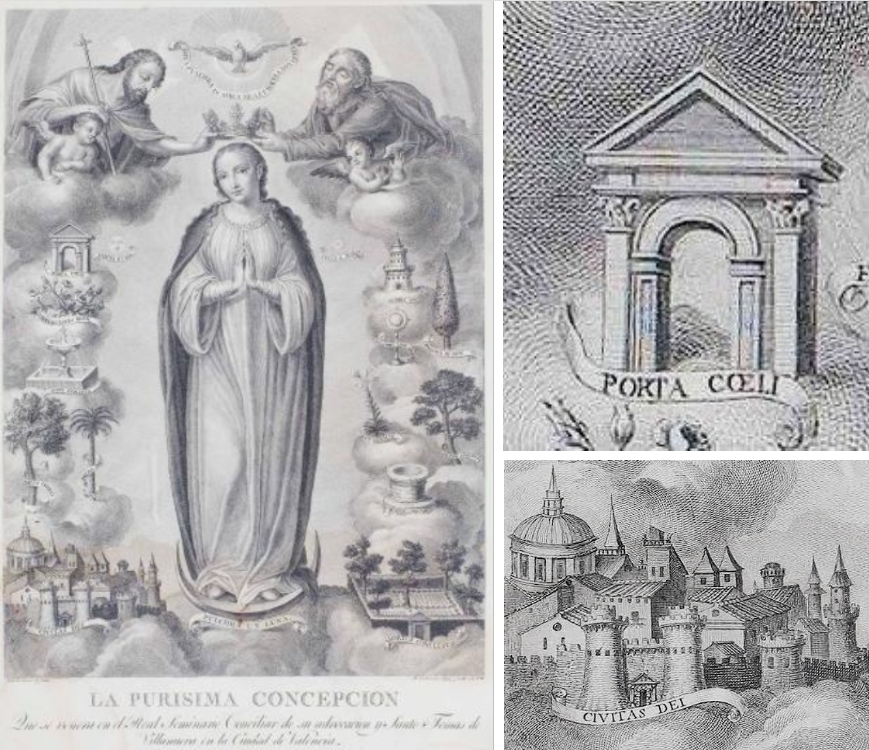Es ist ein Stich in der Größe von lediglich 43 x 30 Zentimeter, entstand im Jahre 1796. Wie üblich wurden die Marienattribute um eine Marienfigur gelegt, rechts oben eine kleine, klassizistische Himmelspforte, die Porta Coeli, und links unten die Civitas Dei als spanische Stadt des Siglo de Oro.
