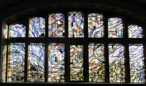 Das Mosaik in hauptsächlich blauen und grünen Pastelltönen lässt vor allem die Himmelspforten der Stadt und den Lebensfluss erkennen. Dieser schwingt sich dynamisch von links oben nach unten und verteilt sich von dort nach rechts oben sowie rechts seitlich. Von den Toren kann man zehn festmachen, weitere Tore lassen sich erahnen. Sie verteilen sich lose über die Bahnen und sind nicht durch Mauern verbunden. Jedes hat eine andere Farbe, manche sind in der Mitte mit einer Linie versehen und haben demnach zwei Flügel. Durch den Fluss und die Tore sollten die Fenster verbunden werden, und, wie es MacLean wünschte, nicht auseinander fallen.