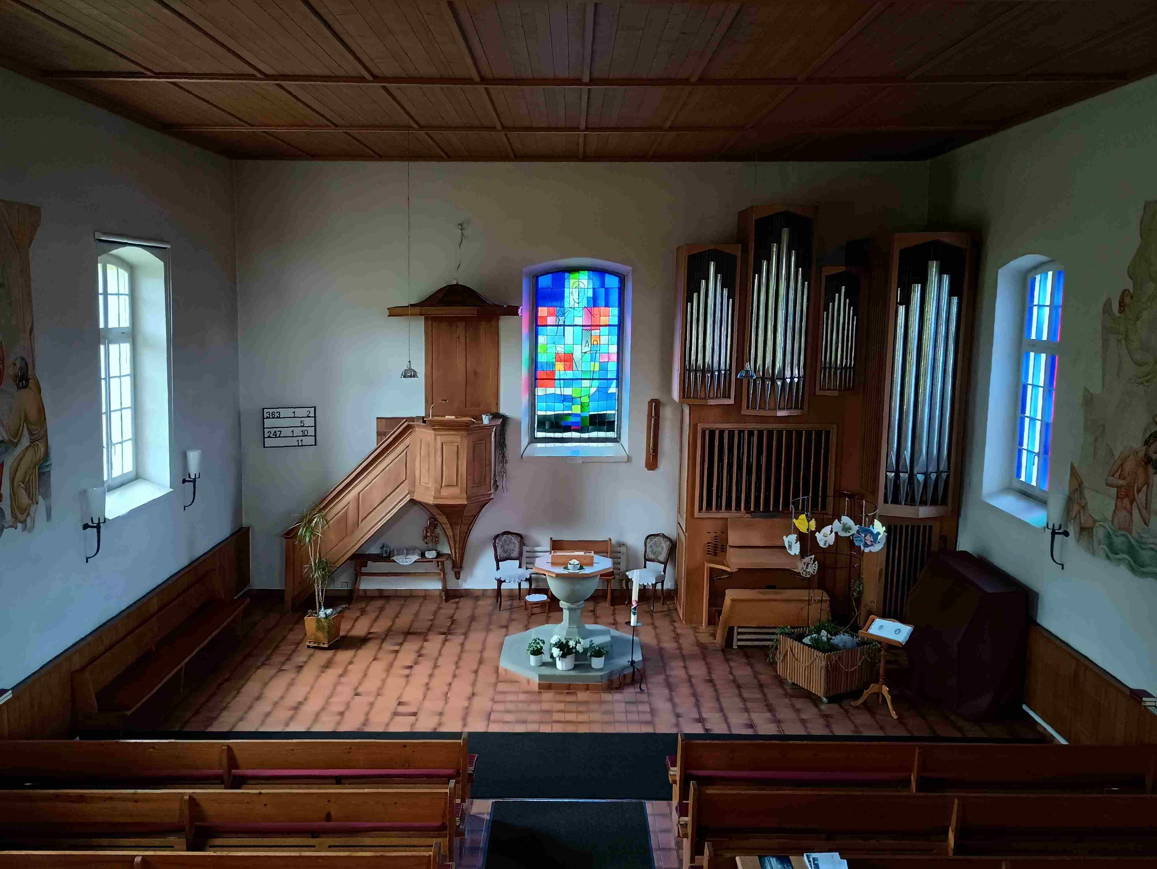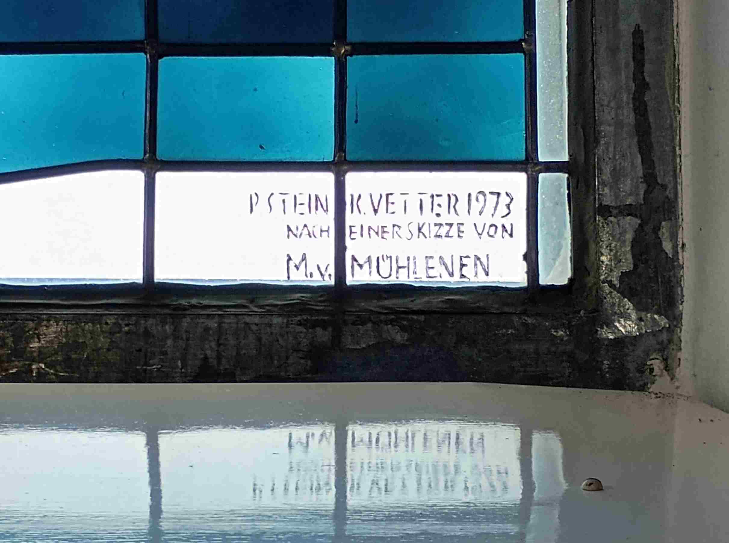 Neben dem Lamm mit dem Kreuz links sind rechts die Kürzel für die altgriechischen Buchstaben Alpha und Omega eingezeichnet. Umgeben ist das Ganze von den zwölf Toren der Stadt, die sich, ebenfalls schwach markiert, in jeweils einem farblich variierendem Quadrat an der linken und rechten Außenseite des Fensters sowie unterhalb des Kopfes der Figur befinden. Die Verteilung ist ungewöhnlich und ergibt kein Quadrat: fünf jeweils am linken und rechten Rand, zwei weitere oben. Stadtmauern zwischen diesen Toren fehlen. Der Berner Künstler und Meister der Glasmalerei, Max von Mühlenen (1903-1971), hatte in seinen letzten Lebenstagen eine Skizze für dieses Fenster entworfen, auf Anregung des örtlichen Pfarrers. Es war eine Arbeit in der Tradition des Bauhauses. Die Scheiben sollten aus zahlreichen Quadraten in unterschiedlicher blauer, roter und grüner Farbe bestehen, was an Bauklötzchen anlehnt. Die Farben Blau und Rot, die traditionell das Himmlische Jerusalem symbolisieren und im Schaffen von Mühlenen eine besondere Bedeutung einnehmen, dominieren auch hier. Der Grafiker Peter Stein (1922-2015), ein Schüler und Freund von Mühlenens, vollendete in Zusammenarbeit mit dem Glasmaler Konrad Vetter (1922-1914) bis 1973 das Werk, worüber die Signatur unten rechts Auskunft gibt.