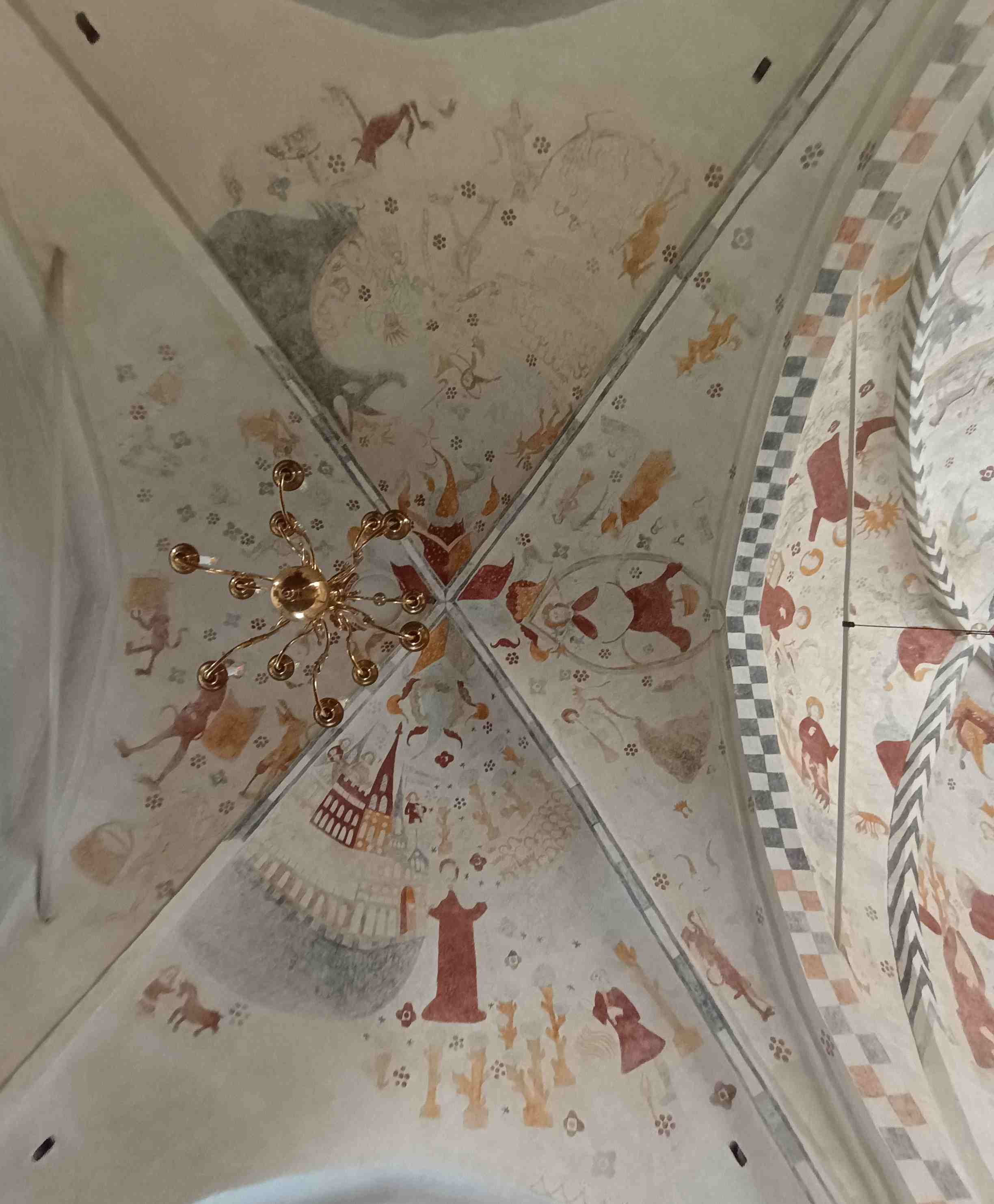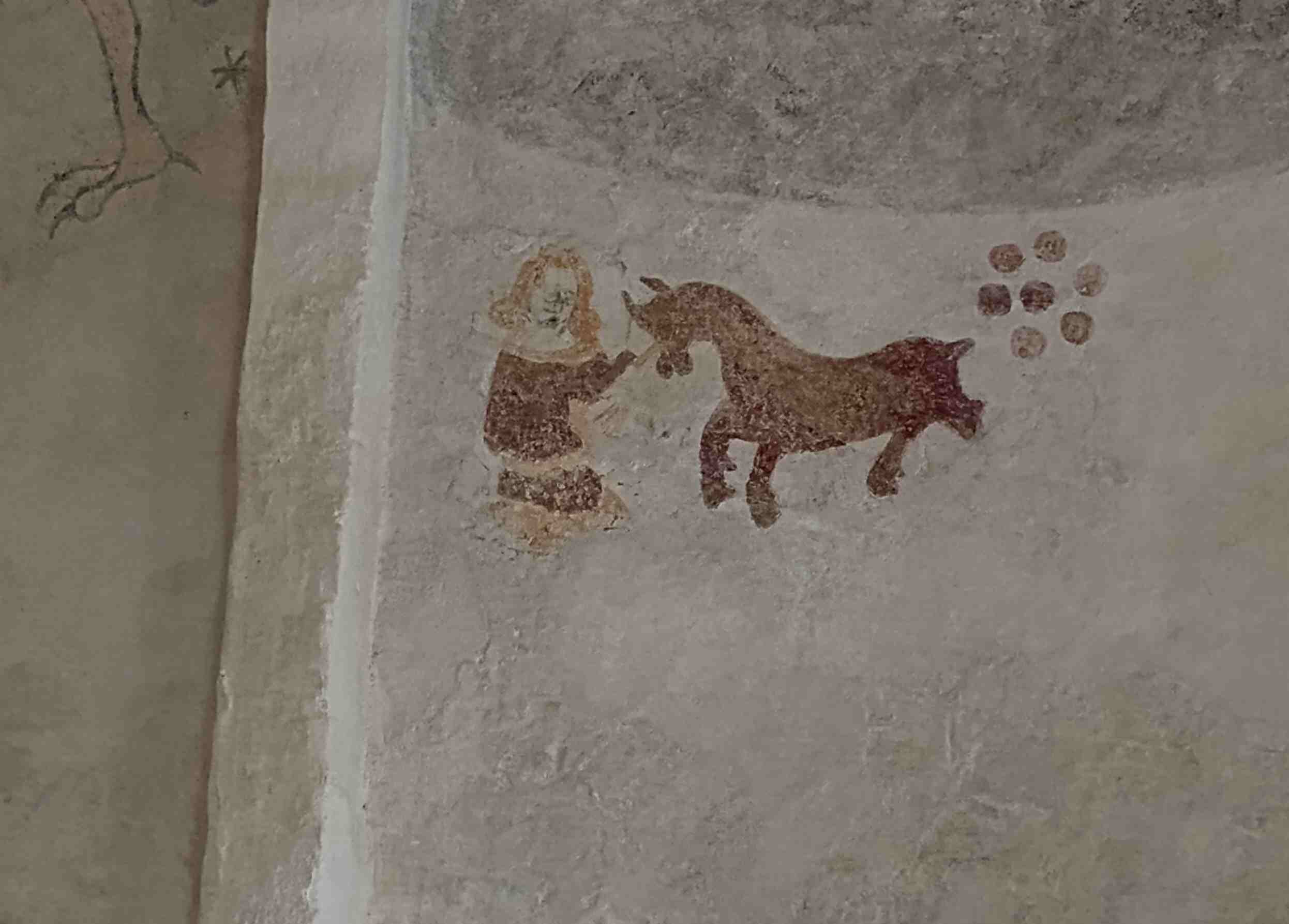 Unter dem Schiff findet man einen Esel neben einer einzelnen Figur. Es handelt sich um eine Darstellung von Ochs und Esel an der Krippe nach dem Lukasevangelium, was in Skandinavien mit dem Himmlischen Jerusalem in Beziehung gesetzt wurde: der Anfangspunkt ist die Geburt Christi auf Erden, der Endpunkt das Neue Jerusalem im Himmel.