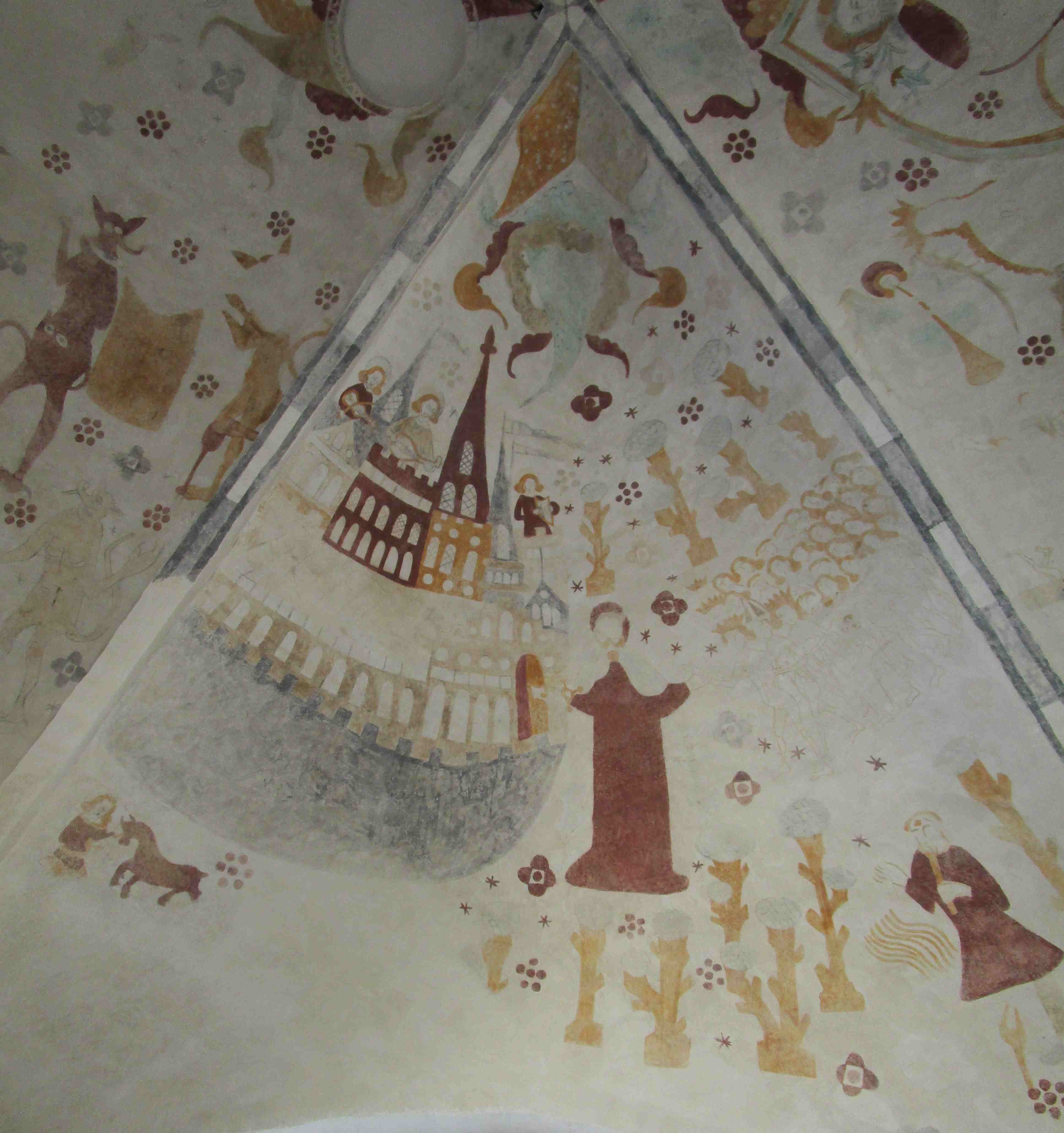 Darunter stehen nicht, wie auch bereits zu lesen war, die sieben Leuchter der Johannesoffenbarung, sondern es handelt sich um einen kleinen Wald stilisierter Bäume mit kantigen Ästen und einer knaufartigen Laubkrone. Die Malereien halten sich mit Besonderheiten nicht zurück, wie überhaupt die dänischen Kalkmalereien an Kuriositäten und originellen Einfällen ähnliche zeitgenössische Weltgerichtsdarstellungen aus Frankreich oder Deutschland bei weitem übertreffen. Kehren wir nochmals zum Fundament der Stadt zurück: sie steht auf einem gewaltigen Schiffsrumpf. Tatsächlich war Hyllested im Mittelalter eine Wohnstätte zahlreicher Matrosen und Hafenarbeiter von Aarhus – das fest gebaute Schiff war für sie eine nachvollziehbare Metapher für einen sichereren Ort. Auch deswegen findet man in vielen skandinavischen Kirchen ein Segelschiff aufgehängt, hier übrigens direkt vor diesem Freskendetail.