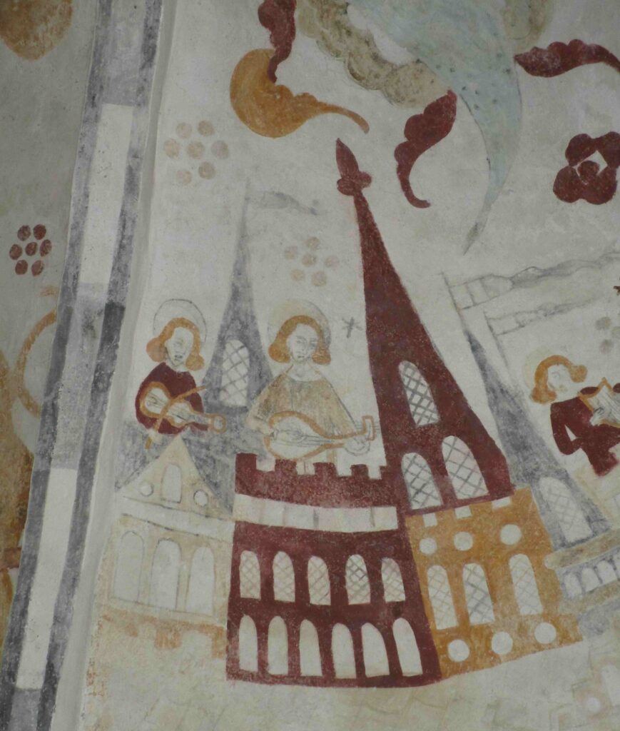 Einige der Bauten sind mit heiligen Musikanten besetzt, die unter anderem eine Harfe und ein geigenähnliches Instrument mit sich führen, vielleicht eine frühe Viole, die zu dieser Zeit gerade in Italien erfunden wurde. Vor der Stadt steht noch eine übergroße Petrusfigur, und es sieht aus, als würde er die vor ihm Stehenden wie einen Chor dirigieren.