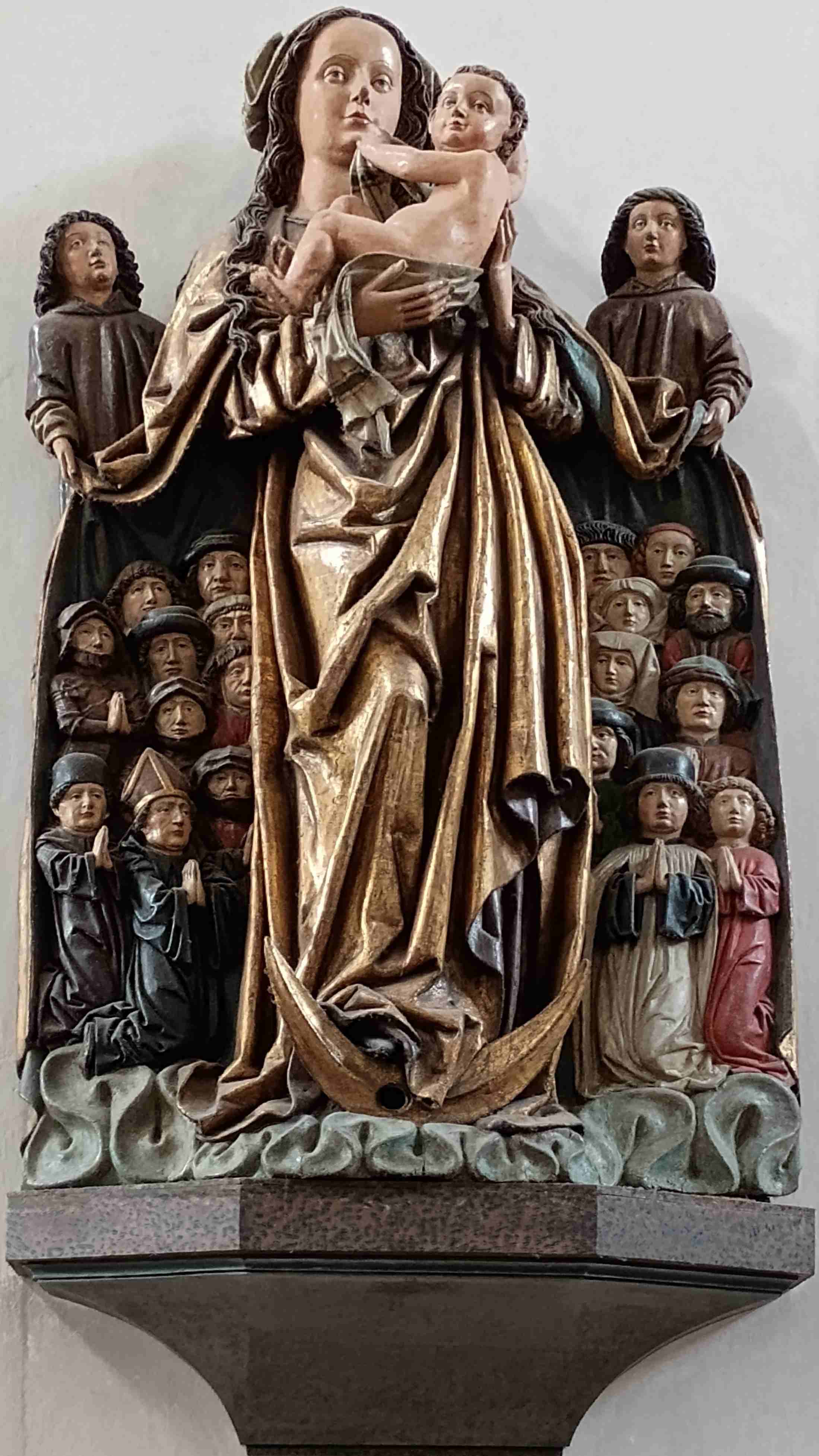 Auf einem Weltgericht in rotbraunem Grundton ist es auf der linken Seite zu sehen. Dominiert wird die Stadt von einem hohen Turm mit einem Tor aus hölzernen Latten, das einst mindestens drei Beschläge zeigte. Es ist noch verschlossen. Die davor angesammelten Menschen werden bei ihrer Bitte um Einlass von der Heiligen Maria unterstützt, die als Himmelskönigin darüber, ebenso hoch wie der Torturm, aufgezeichnet ist. Sie trägt eine mächtige Krone, der nochmals eine Mitra aufgesetzt wurde. Mit ihrem Mantel schützt sie die Gläubigen unter sich, genau so, wie man es bei dem Konzept Schutzmantelmadonna etwa als Skulptur findet: