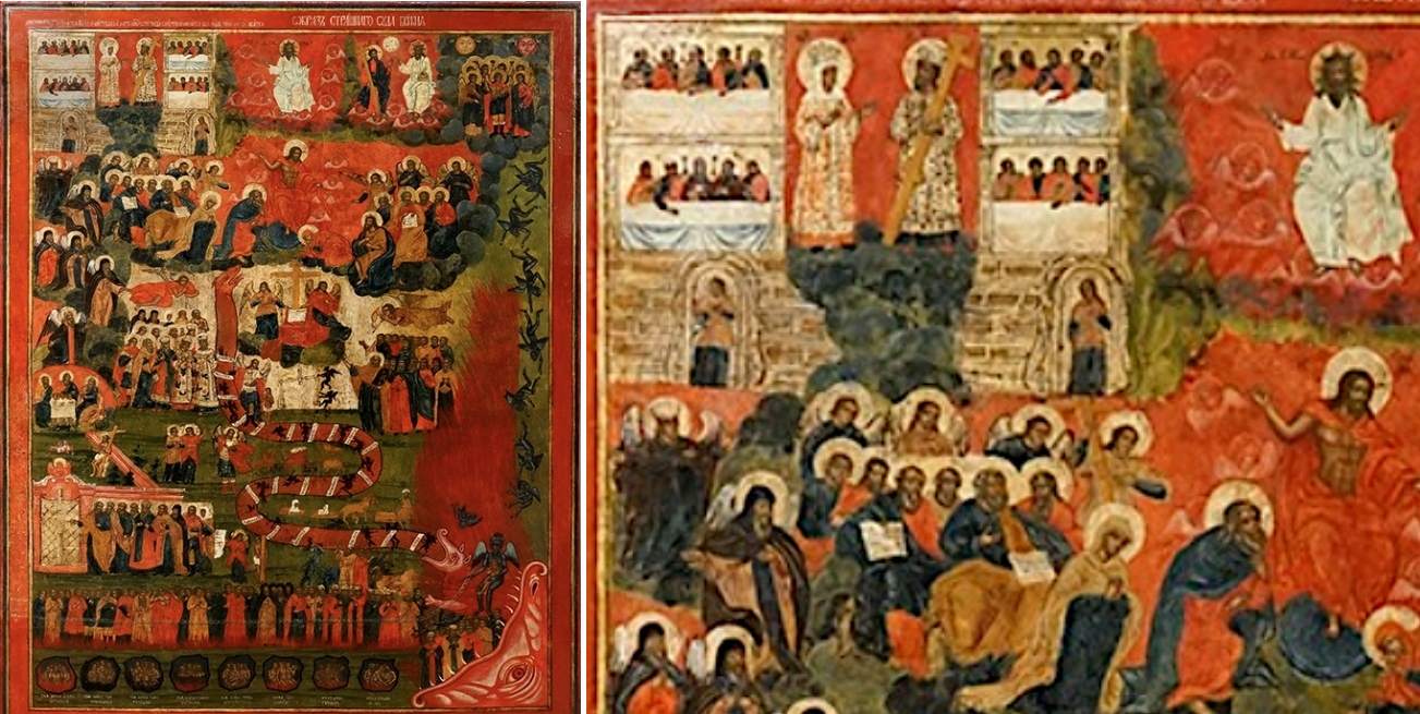 Dieses Beispiel ist eine Weltgerichtsikone aus Soligalich, einer Kleinstadt in der Oblast Kostroma, der bekannt für seine Ikonenproduktion ist. Die Arbeit in Tempera entstand im letzten Viertel des 18. Jahrhunderts. Wie inzwischen populär, wurde an der Himmelspforte Christus zusammen mit Maria, der Königin des Neuen Jerusalems, gezeigt. Das Oval, das diese Personen einfasst, ist noch nicht vollständig ausgearbeitet, aber im Ansatz zu erkennen.