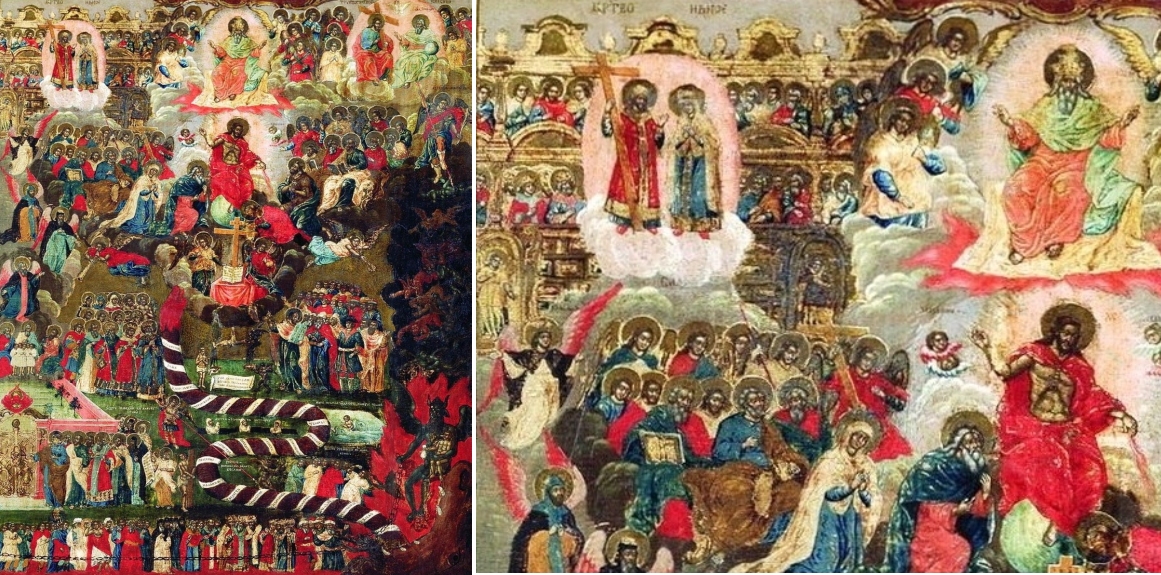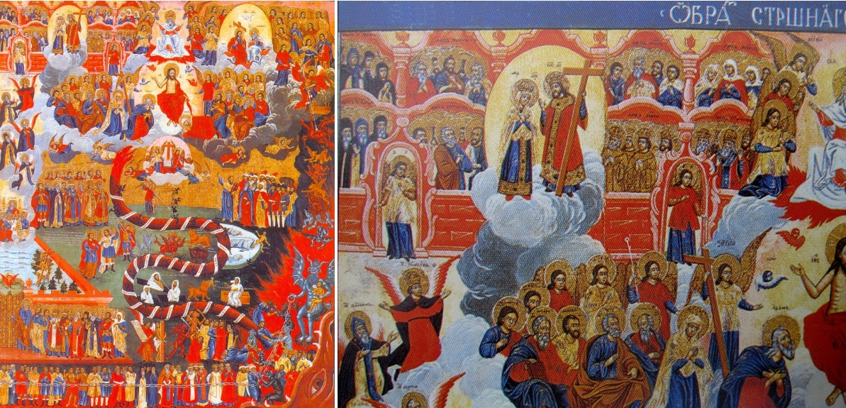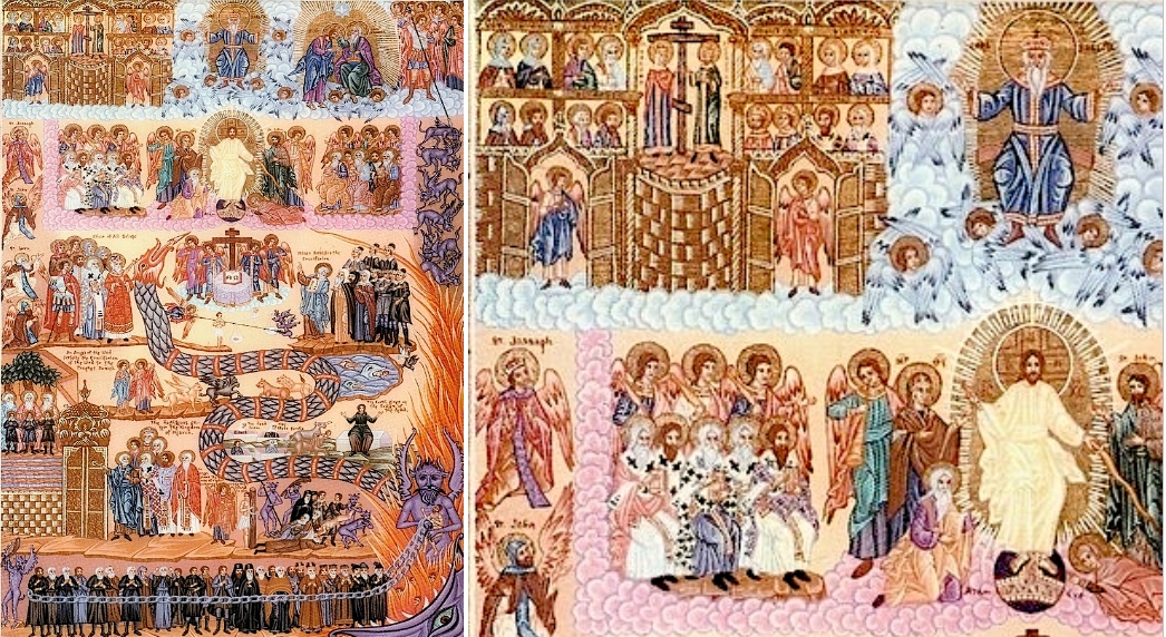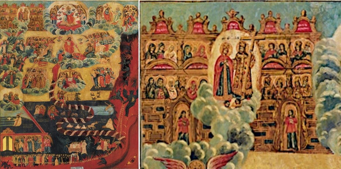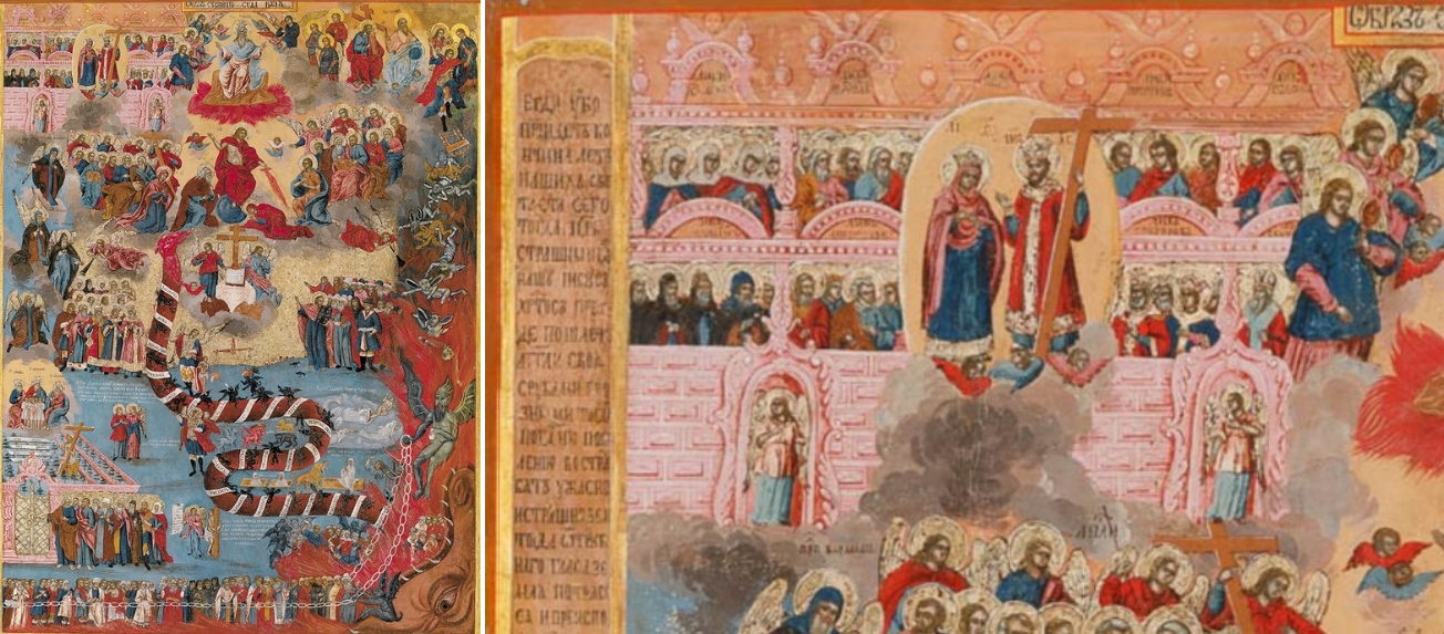 Bezüglich des Himmlischen Jerusalem, welches oben links angebracht ist, gehört das Bild zum Typ der Arkadenikonen, auf denen die Arkaden Jerusalems, wie auch hier, meist übereinander gesetzt in roter Färbung dargestellt sind. Zerteilt ist die Stadt von einem hellen Nimbus, in dem sich Christus und Maria gegenüber stehen, so wie sich auf der gegenüber liegenden Seite Christus und Gottvater gegenüber sitzen. Zu dem Neuen Jerusalem oben links gehört unten rechts das (alte) Paradies. Beide biblischen Orte sind durch ein Band verbunden, auf dem Engel menschlichen Seelen nach oben verhelfen.