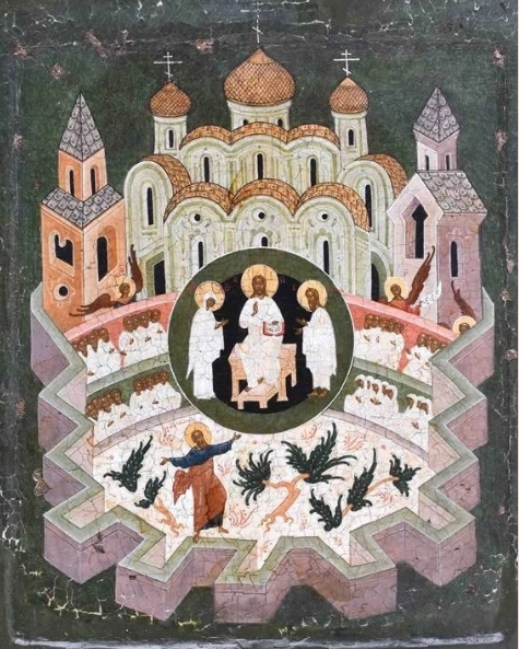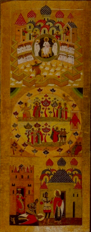 Diese Ikonenmalerei wurde nicht auf eine Leinwand, sondern auf eine hölzerne Tür aufgetragen. Sie zeigt im oberen Drittel das Himmlische Jerusalem mit der Ummauerung vorne, die als Zackenfries seitlich und nach vorne weit in den Raum ausgreift. Dieser Zackenstil ist für das 16. Jahrhundert charakteristisch, vgl. dazu die Ikonentafel aus Nowgorod oder das Jüngste Gericht aus Jaroslawl. Dahinter sind zwölf Türme versammelt, mit roten oder blauen Dächern. Rot und blau stehen für Backsteinschindeln und Schiefer, sind aber auch die beiden Farben Jerusalems. Zwischen der Mauer vorne und den Türmen hinten sind die vierundzwanzig Ältesten hier wiedergegeben. Sie sind im Halbrund angeordnet, und der gesamte Aufbau ähnelt einem Auditorium einer Akademie oder Universität. Auch im 15. Jahrhundert gab es einmal eine solche Darstellung, von Giovanni di Paolo. Die dahinterliegende Idee ist, dass das Neue Jerusalem eine Lehrstätte sei, in der die gläubigen Schüler von Christus unterrichtet werden.