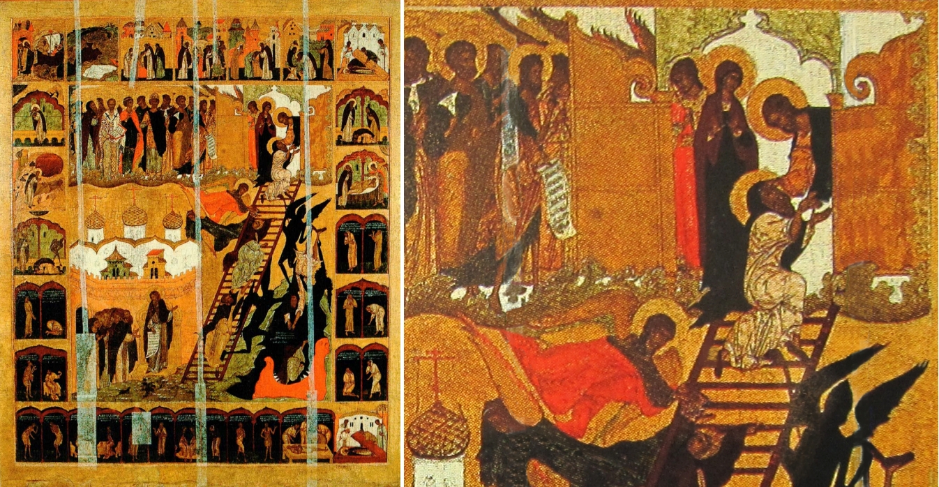 Darstellungen von Tugendleitern waren in der gesamten orthodoxen Kirche und in Kapellen des Ostens beliebt. Diese Darstellung stammt aus Russland um 1600 und ist heute Teil der Sammlung des Staatlichen Historischen Museums in Moskau. Die Temperamalerei entstand im Umkreis der Stroganow-Schule. Im oberen Abschluss ziehen sich zwei Reihen von Arkaden aneinander, in unterschiedlichen Farben, in unterschiedlicher Architektur. In jeder Arkade sitzen Heilige, Geistliche und Adlige beim ewigen Abendmahl. Davon durch ein Wolkenband getrennt wurde rechts die Leister-Szene eingebaut.
