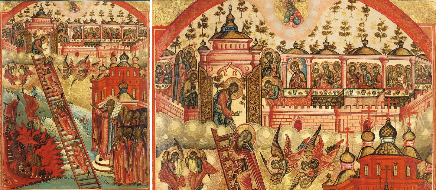 Diese „Tugendleiter“ entstand in Russland um das Jahr 1650. Ungewöhnlich ist die Himmelspforte im oberen Abschluss als halbbogenförmiges Flammentor vermutlich als Gegenentwurf zur Hölle unten. Die Heiligen in den Arkaden an beiden Seiten entsprechen dagegen der traditionellen Darstellungsweise. Die „Begrünung“ zwischen den Arkaden zeigt an, dass auch immer Anklänge von Paradiesvorstellungen in diesen Himmelsszenen mitspielen. Das Tafelgemälde auf Temperabasis (33 x 22 Zentimeter) wird heute im amerikanischen Ikonenmuseum von Clinton aufbewahrt (Nr. R2007.43).