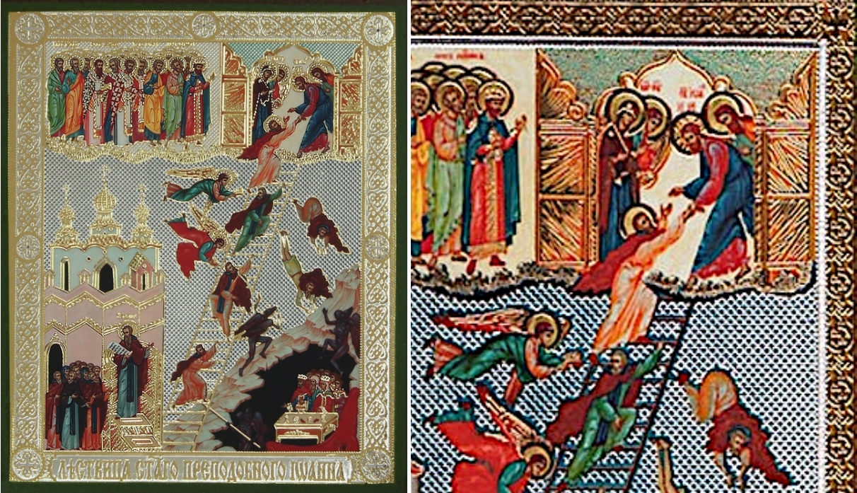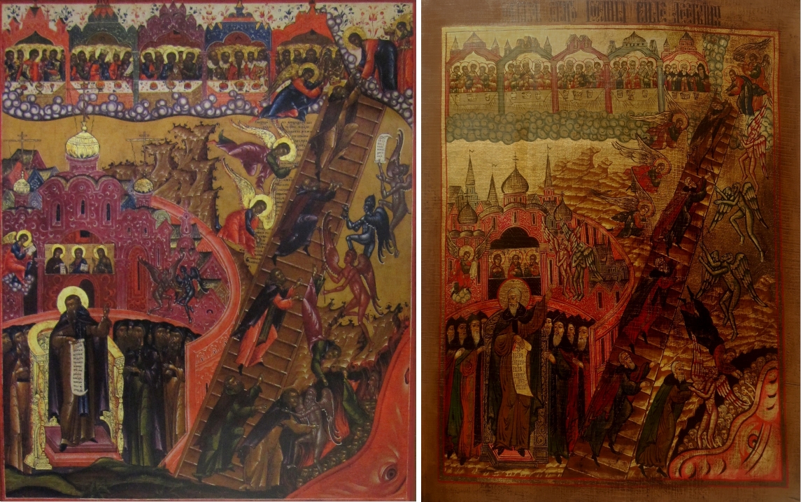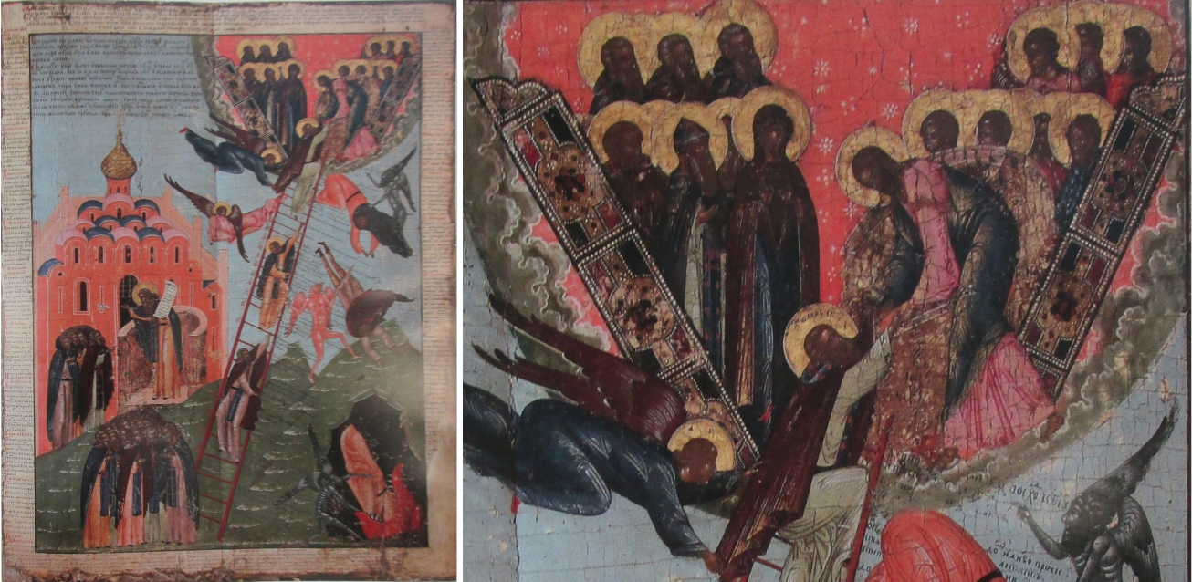 Links: Es haben sich von dem Motiv Tugendleiter auch wenige volkstümliche Beispiele erhalten, wie diese manieristische Ikone aus Mstiora. Sie entstand dort unter Einfluss der Altgläubigen zwischen den Jahren 1875 und 1900. Ihre Größe beträgt lediglich 53 x 44 Zentimeter, konnte also bei Gefahren und Verfolgungen, die diese Glaubensgemeinschaft immer wieder erlitt, schnell versteckt oder mit sich genommen werden. Das Neue Jerusalem ist in Form von fünf Pagoden am oberen Rand dargestellt, die in kräftigen unterschiedlichen Farben leuchten. Rechts: Kurz danach entstand, ebenfalls in Mstiora, um 1900 eine von der Darstellung ganz ähnliche Ikone. Sie war von Beginn an für die Privatkapelle einer Adelsfamilie gedacht, die eine etwas konservativere Gestaltung wünschte, ohne Blumen, aber mit Goldhintergrund.