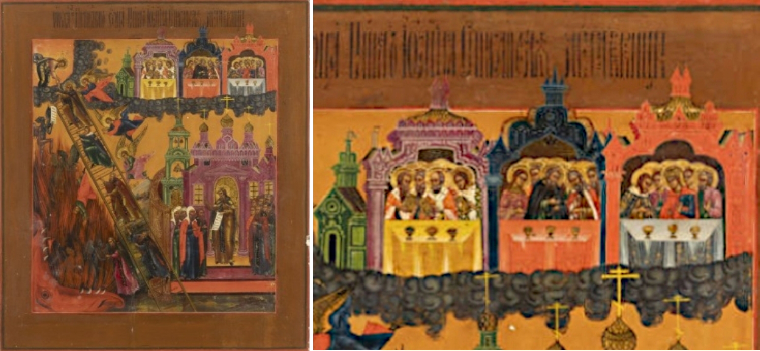 Dieses letzte Beispiel wurde als Miniaturikone in eine größere Ikone in deren Ecke unten links eingesetzt. Es handelt sich also um ein Bild im Bild. Thema der 106 x 70 Zentimeter großen Hauptikone ist „Lobet den Herrn im Himmel“, eine bildliche Umsetzung des Psalm 148. Das Thema der Nebenikone ist „Johannes Klimakos“. Deutlich ist die Himmelsleiter zu sehen, die zur roten Pforte mit dem Neuen Jerusalem führt. Auf den Stufen der Leiter und an der Seite rechts befinden sich mehrere Mönche, was darauf deutet, dass diese Ikone im monastischen Umfeld entstanden ist. Die Person vor der Mönchsgruppe ist nicht etwa Petrus, sondern Johannes Klimakos. Die russische Arbeit aus Vetka ist eine Temperamalerei auf Holz mit Kreidegrund. Datiert ist sie auf der Rückseite auf das Jahr 1888. Sie befindet sich in einer Privatsammlung.