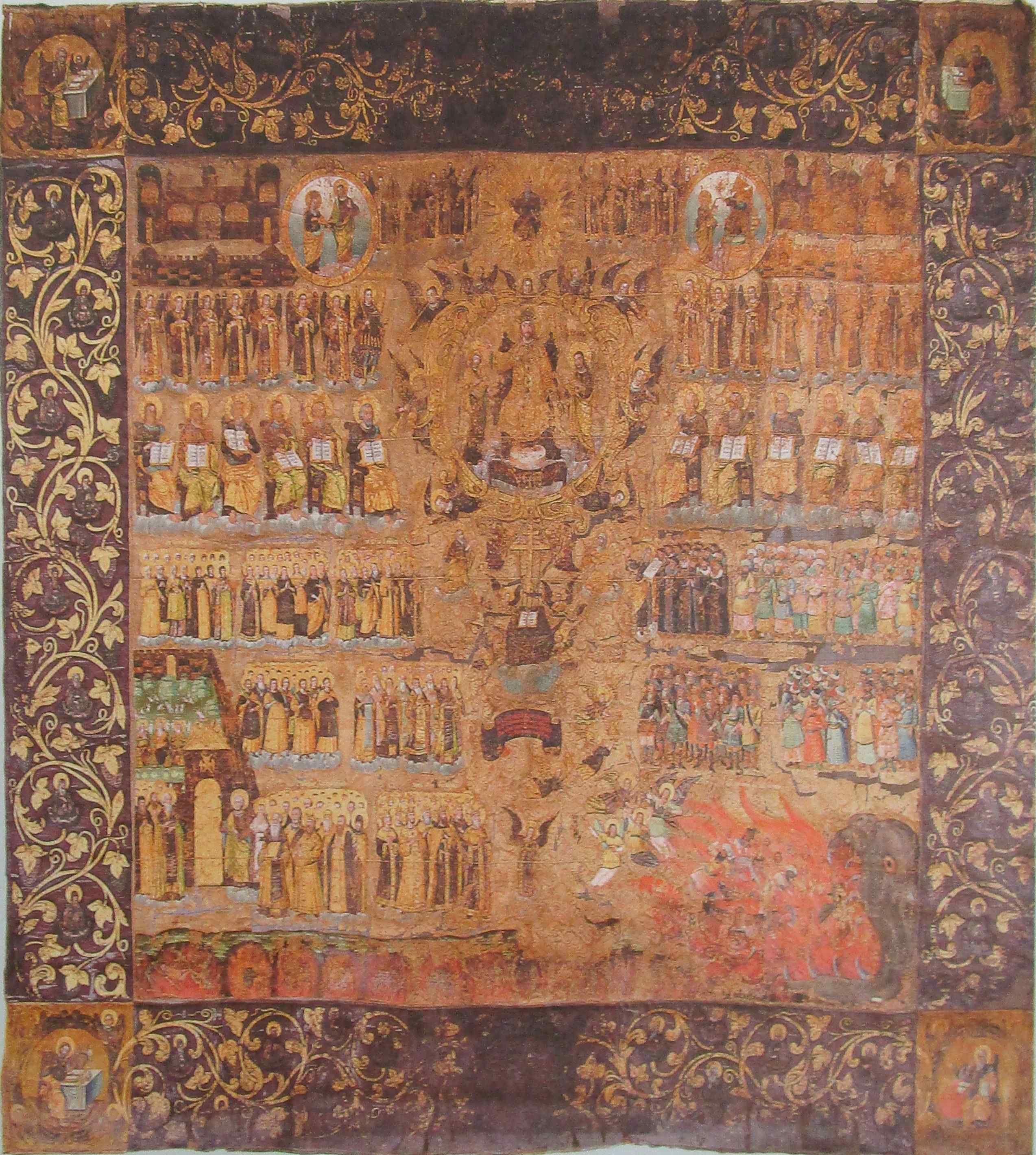 Ikonen auf Textil mit einer Darstellung des Himmlischen Jerusalem sind, vor allem aus der Frühen Neuzeit, etwas sehr Seltenes und Kostbares. Dieses Jerusalemsbanner aus Moskau ist auf das Jahr 1695 datiert. Für die gesamte Ostkirche ist es die älteste erhaltene Darstellung einer Textilarbeit. Man wüsste gerne mehr über die Entstehungshintergründe, aber nicht einmal der Auftraggeber oder der ausführende Künstler sind namentlich bekannt. Die wertvolle und überraschend gut erhaltene Weberei aus Seide in einer goldenen und braunfarbenen Grundtönung hat insgesamt eine Größe von 410 x 370 Zentimetern. Im Jahr 1950 gelangte sie in die Rüstkammer des Moskauer Kreml und wird dort unter der Inventarnummer 3H-1688 aufbewahrt. Die Vorderseite zeigt das Jüngste Gericht bzw. das Weltgericht, die Rückseite den Doppeladler, also das historische Wappen des Zaren bzw. Russlands. Bei dem Weltgericht wird, typisch für die Ostkirche, unten links das Paradies in einem ummauerten Garten mit Paradiespforte gezeigt. Ohne Vorkenntnisse würde man den Paradiesgarten bereits als Himmlisches Jerusalem ansehen.