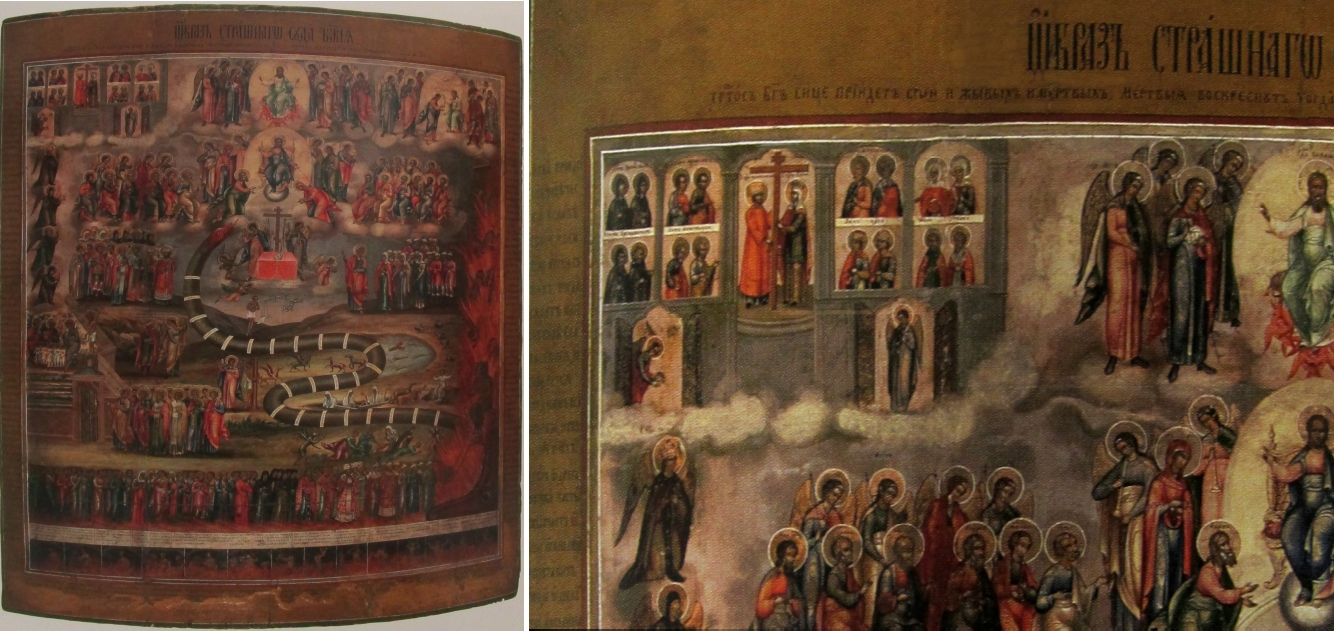 Der Typus „Doppeltür“ fand bald weitere Verbreitung. Eine ähnliche Weltgerichtsikone der Sammlung Mikhail de Boire (Yelizavetin) stammt aus der ersten Hälfte des 19. Jahrhunderts. Entstanden ist sie in der Oblast Vladimir nordöstlich von Moskau. Hier herrscht noch eine grün-bräunliche dunkle Färbung vor, in Folge von Alterung und Umwelteinflüssen.