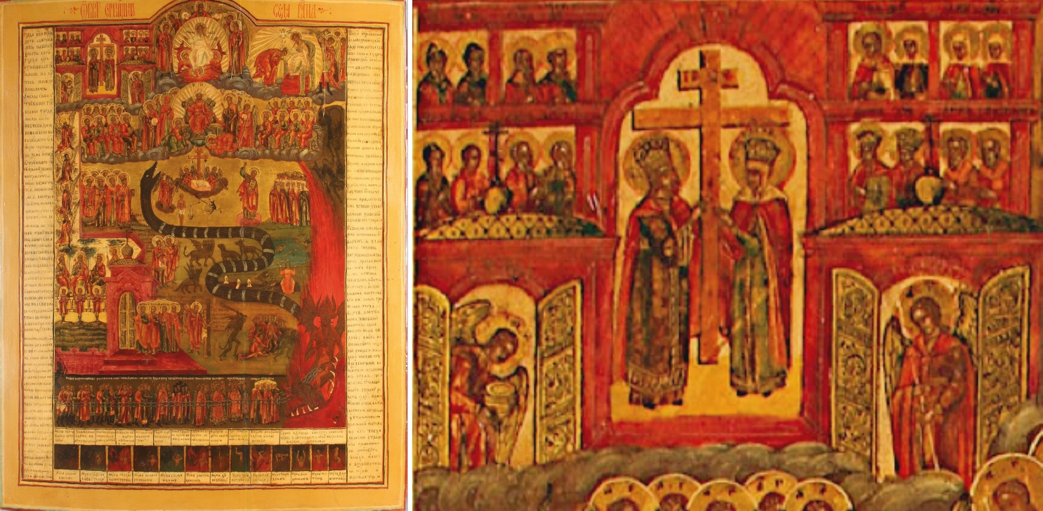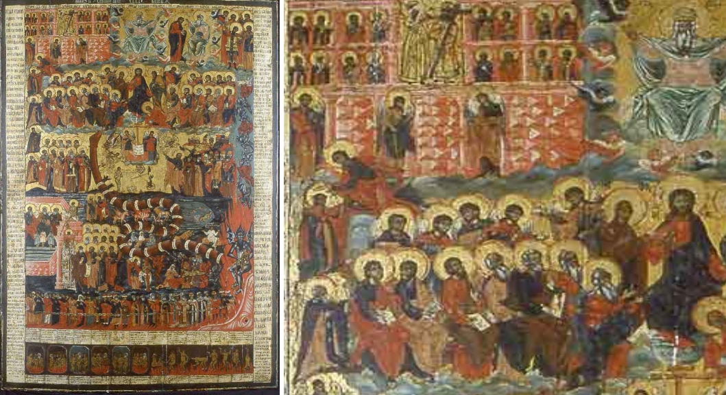 Diese Arbeit besitzt die Kirche des Heiligen Märtyrers Clemens in Moskau. Sie schmückt dort einen Hauptpfeiler der Snamensky-Kapelle im Mittelteil der Kirche. Die 150 x 120 Zentimeter große Temperamalerei (spätes 18. Jh.) wurde 2016 von Ekaterina Grabas-Smolentseva umfangreich restauriert, seitdem ist die grün-bräunliche Verschmutzung entfernt, die Ikone hat wieder ihre ursprünglich rot-gelbliche Färbung. Auf der Malerei auf Temperabasis hat man mehrere kompositorische Stilelemente vereint: Die Arkaden, in denen Heilige versammelt sind, kennt man bereits von den ersten erhaltenen Weltgerichtsikonen der Frühen Neuzeit. Die Hereinnahme des Patriarchenkreuzes in eine größere, zentrale Hauptarkade geht auf eine Ikone der Auferstehungskirche/Grabeskirche (um 1600) zurück. Die beiden Himmelspforten im unteren Bereich, mit jeweils einem Engel besetzt, sind dagegen von Ikonen mit der Darstellung der Himmelfahrt Mariens entliehen. Zwischen ihnen ist ein Stück Wand gesetzt, das die Stadtmauer Jerusalems repräsentiert. Sie springt im Zackenstil vor und zurück und besteht aus Steinen, die wie Fliesen aussehen. An der linken Randseite werden Gerettete von Engeln nach oben gebracht, was man von vielen älteren Werken her kennt (Typus Fahrstuhlikone).