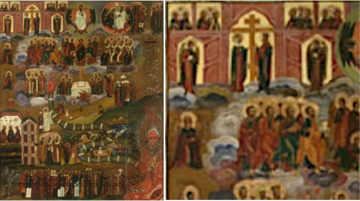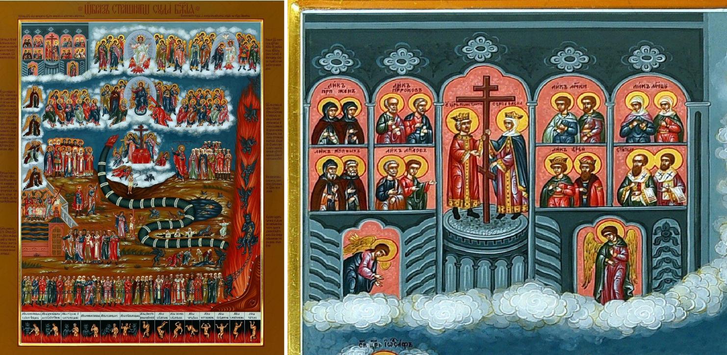 Ein weiteres Kunstwerk dieser Konzeption stammt aus dem späten 19. Jahrhundert, etwa von 1875. Es wurde mit Tempera gemalt und ist lediglich 53 x 45 Zentimeter klein. Vermutlich stand es einst auf einem Altar, möglicherweise im privaten Bereich. Links oben ist das Himmlische Jerusalem zu finden: Auf dem Ausschnitt sind auch hier die zwei charakteristischen Himmelspforten zu sehen, die beide für Heilige weit geöffnet sind. Bemerkenswert sind die reichlich ornamentierten Türflügel dieser Pforten, in denen Engel stehen. Einige Heilige sind bereits angekommen und feiern in den unteren der insgesamt acht Arkaden das ewige Abendmahl. Viele russische Ikonen wurden von etwa 1990 bis 2020 zunächst in Englands Auktionshäusern gehandelt. Auch diese Weltgerichtsikone war davon betroffen; sie stand 2018 in London zum Verkauf an.