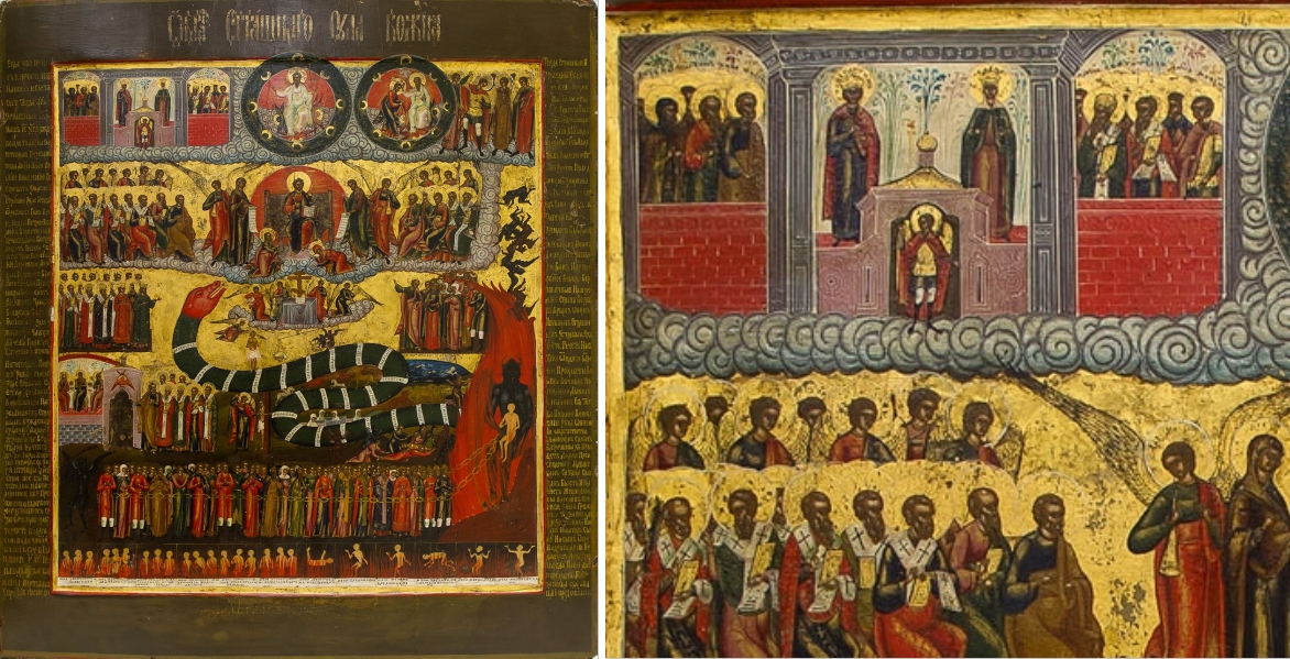 Ein weiteres Kunstwerk dieser Konzeption stammt aus dem späten 19. Jahrhundert, etwa von 1875. Es wurde mit Tempera gemalt und ist lediglich 53 x 45 Zentimeter klein. Vermutlich stand es einst auf einem Altar, möglicherweise im privaten Bereich. Links oben ist das Himmlische Jerusalem zu finden: Auf dem Ausschnitt sind auch hier die zwei charakteristischen Himmelspforten zu sehen, die beide für Heilige weit geöffnet sind. Bemerkenswert sind die reichlich ornamentierten Türflügel dieser Pforten, in denen Engel stehen. Einige Heilige sind bereits angekommen und feiern in den unteren der insgesamt acht Arkaden das ewige Abendmahl. Viele russische Ikonen wurden von etwa 1990 bis 2020 zunächst in Englands Auktionshäusern gehandelt. Auch diese Weltgerichtsikone war davon betroffen; sie stand 2018 in London zum Verkauf an.