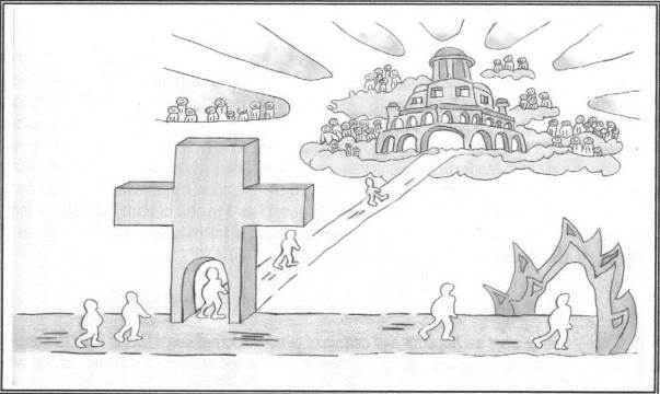 Eine andere „Bridge-Darstellung“ findet sich in dem Band „Bible Workbook“, um 2010 herausgebracht von Alpha & Omega Publications. Man findet die Handzeichnung dort auf Seite 15. Es ist eine der wenigen Grafiken dieses Motivs in schwarz-weiß, erst die später erschienen Fassungen wurden dann koloriert. Einige Menschen – kleine weiße Spielfiguren ohne Gesichter – durchschreiten ein Kreuz oder eine Kreuzpforte, um dann auf einer schmalen Bahn in das Neue Jerusalem zu laufen. Jerusalem schwebt als futuristischer Tempelbau zwischen den Wolken, wo sich immer wieder Menschen in Gruppen zusammengefunden haben. Unten schlagen andere Menschen den breiten Weg ein, um an eine Höllenpforte zu gelangen.