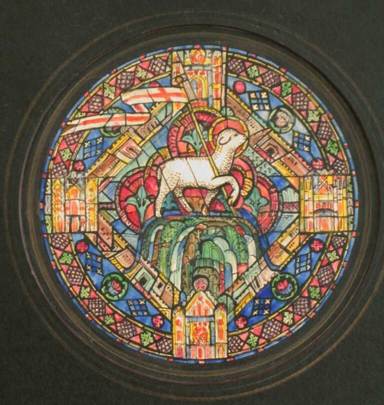 Die neuen Fenster haben den Anfang und das Ende der Welt aus biblischer Sicht zum Thema, also die Schöpfungsgeschichte und die Apokalypse. Das erste an der linken Wandseite gegenüber dem Altar hat den Titel „Das Lamm im Himmlischen Jerusalem“. Wie die übrigen Fenster wurde es 1974 von Eugen Keller (1904-1995) gestaltet, einem Künstler, der vor allem Kirchen in Rheinland-Pfalz und Nordrhein-Westfalen ausgestattet hat. Glasarbeiten sind aber nur ein geringer Teil des umfassenden Schaffens des Künstlers, der auch Fassaden gestaltet hat, an Denkmälern mitwirkte und Brunnen entwarf. Die wenigen Kirchenfenster Kellers, die stets im Abstand einiger Jahre entstanden, deuten darauf hin, dass der Künstler lange und sorgfältig an den passenden Lösungen arbeitete. Auch die Motive in der Kirche am Kolk sind durchdacht und sorgsam ausgeführt. Sie waren einer der Argumente, die Kirche trotz ihrer Zerstörungen 1984 unter Denkmalschutz zu stellen.