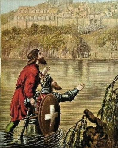 Diese Illustration hat den Titel „Christian and Hopeful entering the river“. Auch hier ist es gelungen, Kronheim als Künstler zu identifizieren. Offensichtlich gestaltete er um 1870 einen ganzen Reigen zu dem Werk Pilgrim‘s Progress, die als hochwertige Einzelblätter von Kunstsammlern geschätzt waren und die noch im 21. Jahrhundert auf Auktionen gehandelt werden. Die Arbeit ähnelt „Christian and Hopeful cross the river“, wobei der Ritter bereits von seiner Rüstung (und seinem Unglauben) nach unten gezogen wird. Bemerkenswert ist die Stadt Jerusalem an anderen Ufer: Von dem Haupttor strömen zahlreiche Menschen nicht in die Stadt, sondern den beiden Neuankömmlingen entgegen.