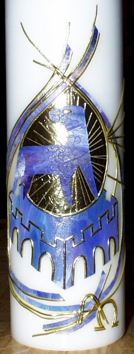 Durch die Rundung der Kerze ist es nicht leicht, die quadratische Stadt mit all ihren Elementen (Lebensfluss, Engel, Lebensbaum, Lamm Gottes, Bauten wie Wohnhäuser der Einwohner und Einwohnerinnen etc.) zur Darstellung zu bringen. Um so mehr freut es mich, hier einige seltene, aber doch schöne und anrührende Kerzen dokumentieren zu können.