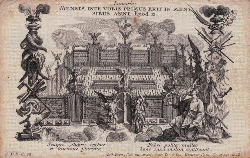 Gottfried Bernhard Göz (auch Goez oder Götz, 1708-1774) war ein bekannterer Barockkünstler, seine Malereien haben sich in der Wallfahrtskirche Birnau, der Stiftspfarrkirche St. Kassian in Regensburg und im Schloss Leitheim erhalten. Göz stammt aus Mähren und zog 1730 nach Augsburg, dem damals führendem Zentrum Europas für Kupferstiche. Er fertigte, neben seinen Malereien, bald auch eigene Stiche an, vor allem für Verleger frommer Werke. Dazu arbeitete er in den 1730er Jahren eng mit den Gebrüdern Joseph Sebastian und Johann Baptist Klauber in ihrer gemeinsamen Werkstatt mit angegliedertem Verlag. Die dort produzierten Kupferstiche tragen stets die Signatur „Göz et Klauber“. Dort entstanden erste „freie“ Kupferstiche ohne Rahmung, die als „freye Manier ohne viereggigte Raehm oder Fassung des Bildes“ bezeichnet wurden und die Göz sich später durch ein kaiserliches Privileg schützen ließ, obwohl er selbst nicht der Erfinder solcher Werke gewesen war. Eine solche „Rahmenfreiheit“ ist auch hier der Fall. Es handelt sich um eine Serie von zwölf Blättern, die die Monate thematisieren, im vorliegenden Fall den Monat Januar. Warum gerade dieser erste Monat dazu ausgewählt wurde, das Neue Jerusalem zu zeigen, wird nicht erklärt. Über der Stadt Jerusalem findet sich ein lateinisches Zitat aus dem zweiten Buch Moses, Kap. 12, Vers 2: „Dieser Monat soll bei euch der erste Monat sein, und von ihm sollt ihr die Monates des Jahres anfangen“.