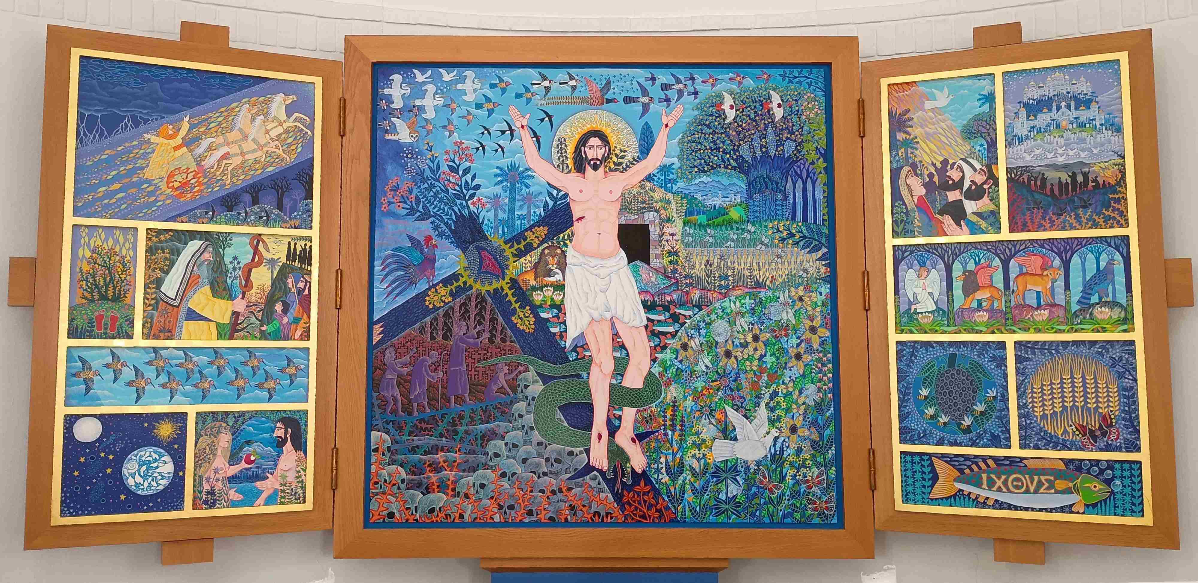 Esben Hanefelt Kristensen (geboren 1952) aus Aalborg (Dänemark) entwickelte einen eigenständigen, unverwechselbaren Stil ihrer Malereien. Dieser zeichnet sich aus vor allem durch sorgfältige Kleinteiligkeit, kräftige Farbwahl und gekonnt naive Darstellungsweise. Ihre religiösen Bilder wurden vor allem über Bibeln, auch Kinderbibeln, populär und einem größeren Publikum bekannt. Daneben entstanden aber auch sakrale Malereien für evangelische Kirchengemeinden, die dort meist den Altarbereich schmücken. Im Jahr 1998 entstand ein Triptychon für die evangelische Kirche des Ortes Hadsund im Südosten der Mariagerfjord-Kommune in der Region Nordjylland. Dort befindet sich ein nüchterner Backsteinbau aus dem Jahr 1898. Anlässlich des 100-jährigen Kirchenjubiläums im Jahr 1998 wurde der gesamte Altarbereich renoviert und ein neues Altarbild angefertigt. Dieses Bild ist der zentrale und farbige Bezugspunkt der ansonsten weißen Kirche.