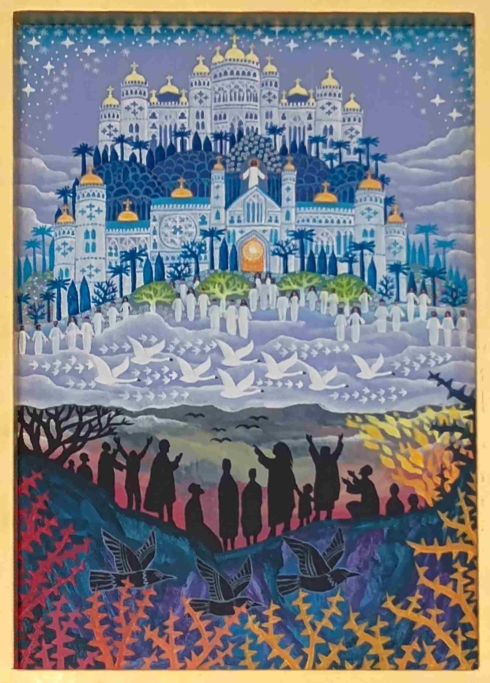 Der rechte Altarflügel zeigt auf der Innenseite unter weiteren Motiven des Neuen Testaments auch das Neue Jerusalem, das mit zahlreichen Kuppeln und weiß-blauer Fassade an orthodoxe Architektur erinnert – durchaus stimmig, denn auch die Handsun-Kirche wurde nach griechisch-orthodoxem Vorbild als Zentralkirche errichtet. Die Inspiration für dieses Werk stammt aus den Versen 1 bis 5 des 21. Kapitels der Offenbarung. Im unteren Teil bewegt sich die Schöpfung auf das Himmlische Jerusalem zu, vor allem Menschen und Vögel. Sind sie im unteren Bereich noch dunkel und schwarz, so werden sie nach oben heller und weiß. Die Äste im unteren Bereich verstärken den Blickwinkel auf die Stadt, der alles zuströmt. Dort ist das einzige lebendige Zeichen eine weiße Figur (Christus) mit einem Heiligenschein. Sie steht auf dem Giebel des Haupttores und begrüßt mit offenen Händen die Ankommenden. Die Stadt zu Seiten der Figur ist symmetrisch aufgebaut, weiße Fassaden mit goldenen Kuppeln erinnern an orthodoxe Kirchenbauten. Die Stadt ist in drei Zonen geteilt und formiert ein Dreieck, dessen Spitze sich im Zentralbau über der Christusfigur befindet. Die untere Zone stellt die Mauern und Tore der Stadt dar, dann folgen blaue Hügel mit Palmen besetzt. Den Hügel, der sich hier bildet, bekrönen die Kirchenbauten in der obersten Zone.