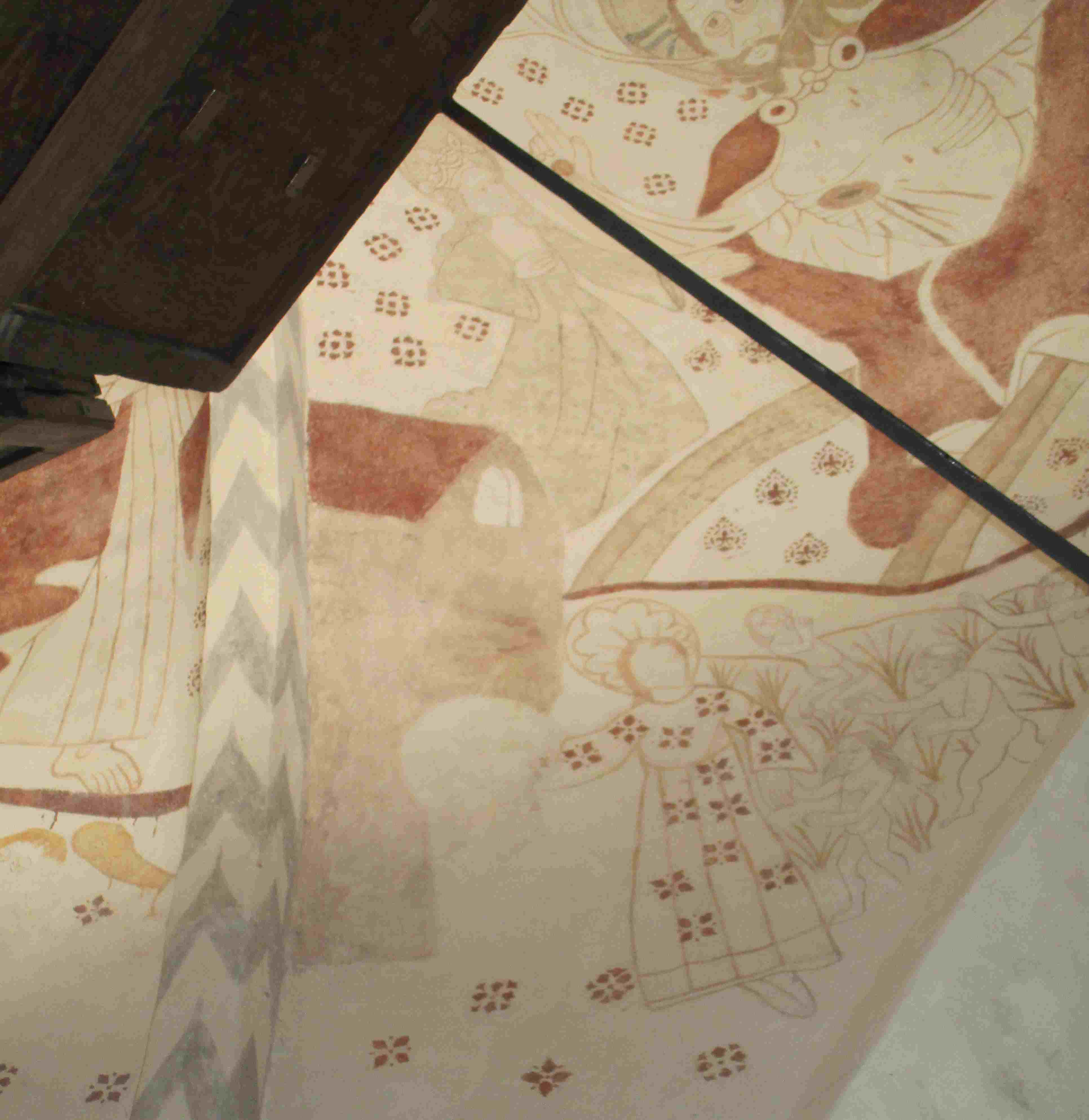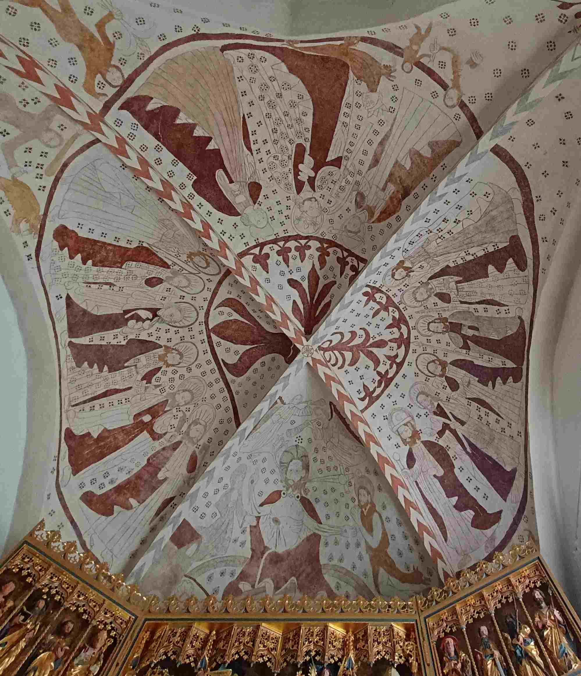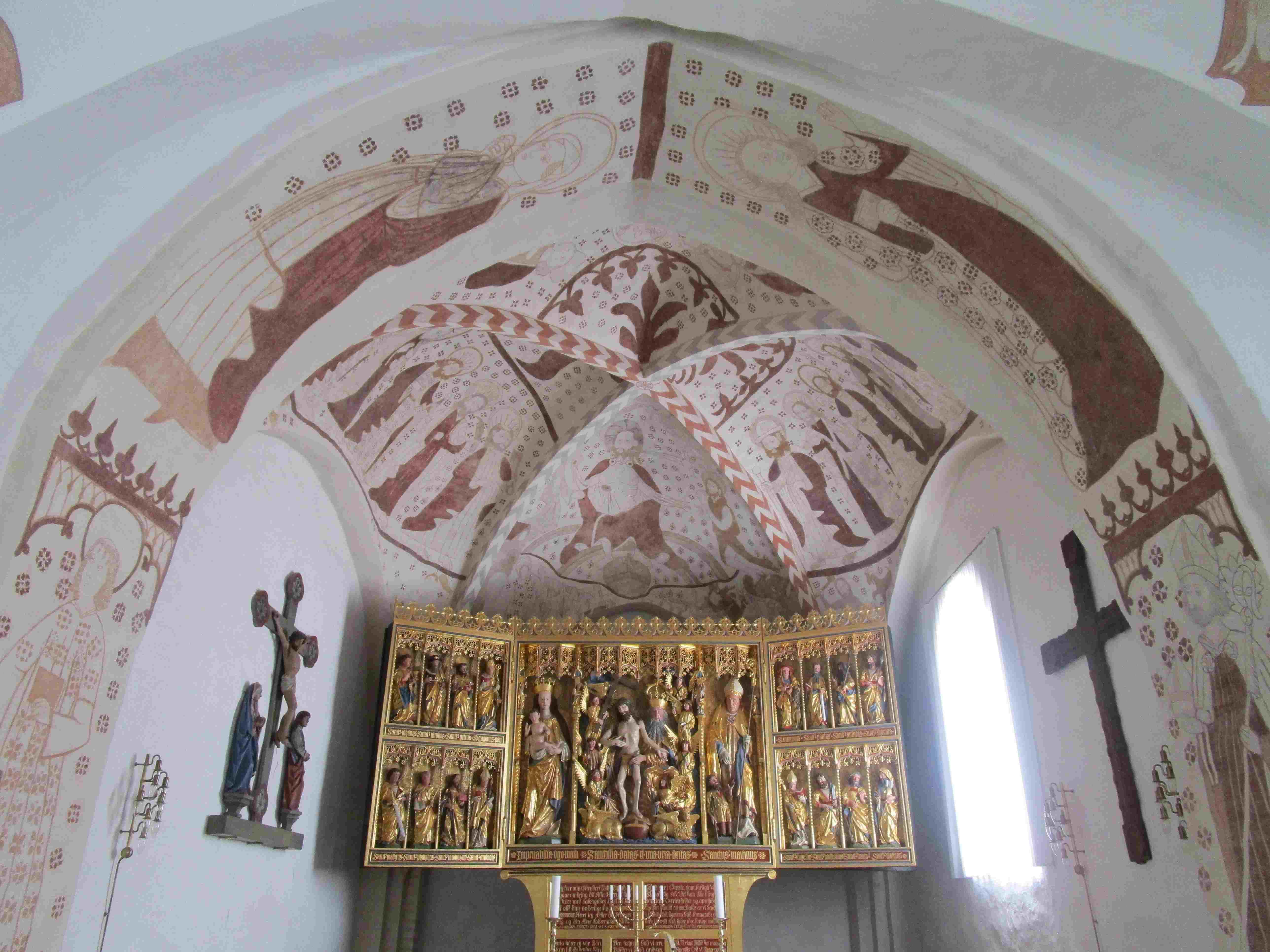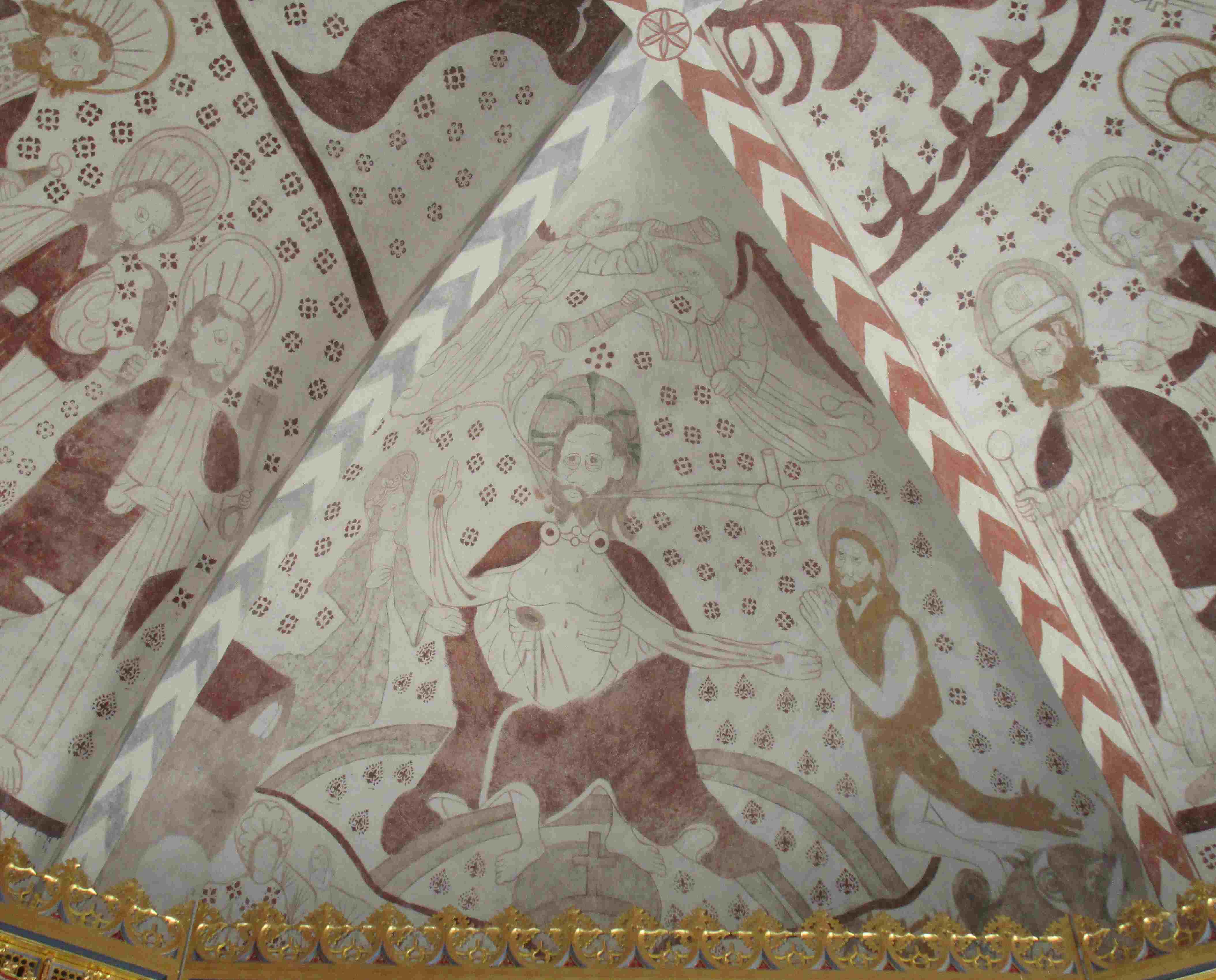 Christus thront hier auf einem doppelten Regenbogen, darunter eine Erdkugel, links Maria, rechts Johannes der Täufer. Dass sich neben diesen beiden Figuren auch noch das Himmlische Jerusalem nahe bei Maria und die Hölle bei Johannes befinden, ist kaum zu erkennen. Erstens versperrt der erwähnte Altar Teile des Wandgemäldes – ursprünglich war dies nicht der Fall, da der jetzige Altar zwar hervorragend in die Kirche passt, aber erst um 1765 hier aufgestellt wurde. Zweitens ist die Farbgebung und Umrisszeichnung der Restaurierung so blass, dass man Einzelheiten kaum wahrnehmen kann. Drittens verhindert die konkave Krümmung gerade an den Rändern eine gute Sicht.