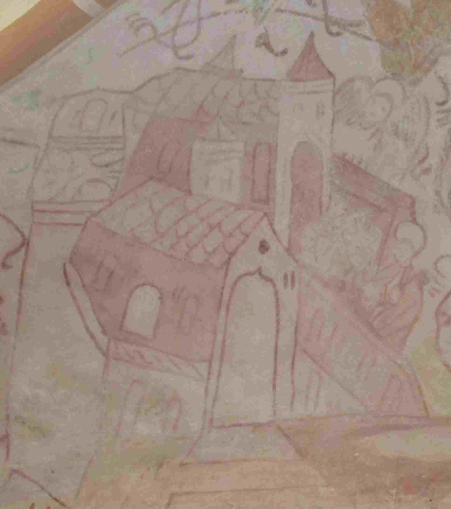 Die daran angrenzenden Bauten erinnern an zwei oder drei übereinander gesetzte Kirchen; man erkennt eine expressiv wirkende Agglomeration ineinander und übereinander verschobener Bauten – solche Architekturdarstellung kam damals aus Skandinavien, etwa über die Isefjordwerkstatt und ihrer Wandmalereien von Tuse (ebenfalls um 1470). In Waase ist an den Seiten hohes Mauerwerk zu ahnen. Die beiden Eingänge in die Kirchen stechen besonders hervor. Die gesamte Malerei basiert auf Rottönen echten Ochsenbluts, was früher in ganz Europa ein preiswerter und gängiger Farbstoff gewesen war.