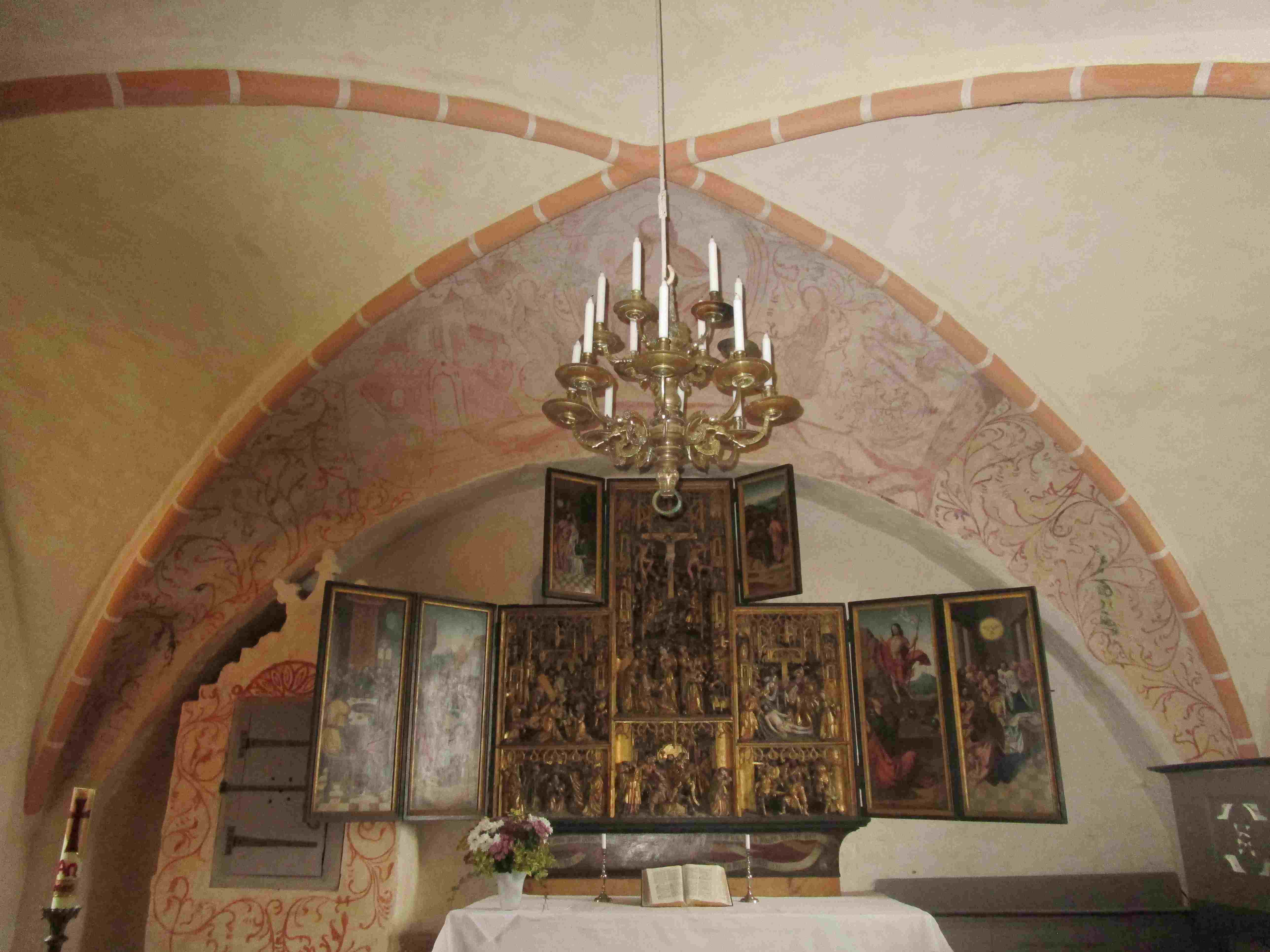Die Freskenmalereien im älteren Altarbereich wurden auf das 15. Jahrhundert geschätzt. Nach der sorgfältigen Restaurierung 2025 und einer dendrochronologischen Analyse des umliegenden Holzes ist eine Entstehungszeit um 1470 angemessen. Der konkav eingezogene Triumphbogen zeigt Christus in einer spitzen Mandorla auf einem Regenbogen thronend. Links davon kniet Maria, dann folgt eine kleine, leicht zu übersehende Figur: Es ist Petrus, der hier vor einem ummauerten Garten oder einem Vorhof steht, der anscheinend mit kleinen Menschen, den geretteten Seelen, angefüllt war.