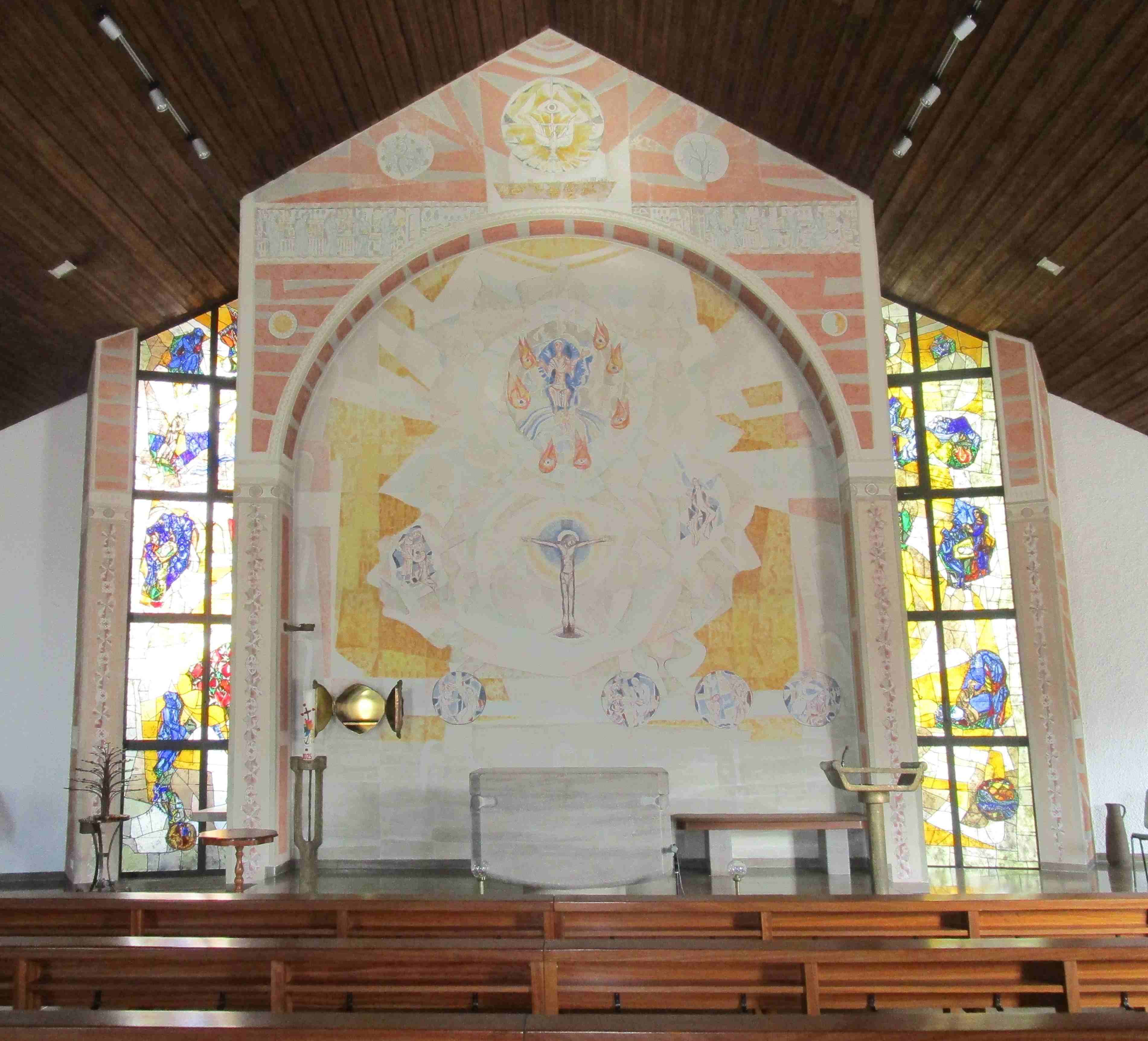Im Inneren wollte man einen bewussten Bruch zur bisherigen Sakralkunst, und man hatte einen zuverlässigen Traditionsbrecher gefunden, der auch schon anderswo für Aufsehen gesorgt hat: Peter Valentin Feuerstein (1917-1999), der nicht unweit vom Ort in Neckarsteinach sein Atelier hatte. Zwischen 1955 und 1990 hat der Künstler in Baden das Neue Jerusalem auf ein halbes Dutzend Glasfenster gebracht, als Wandmalerei findet man es in seinem Schaffen nur in Mückenloch. Der Künstler war schon vor dem Abriss mit den Örtlichkeiten vertraut, seit er in der Nachbargemeinde Dilsberg Fenster ausgeführt hatte.