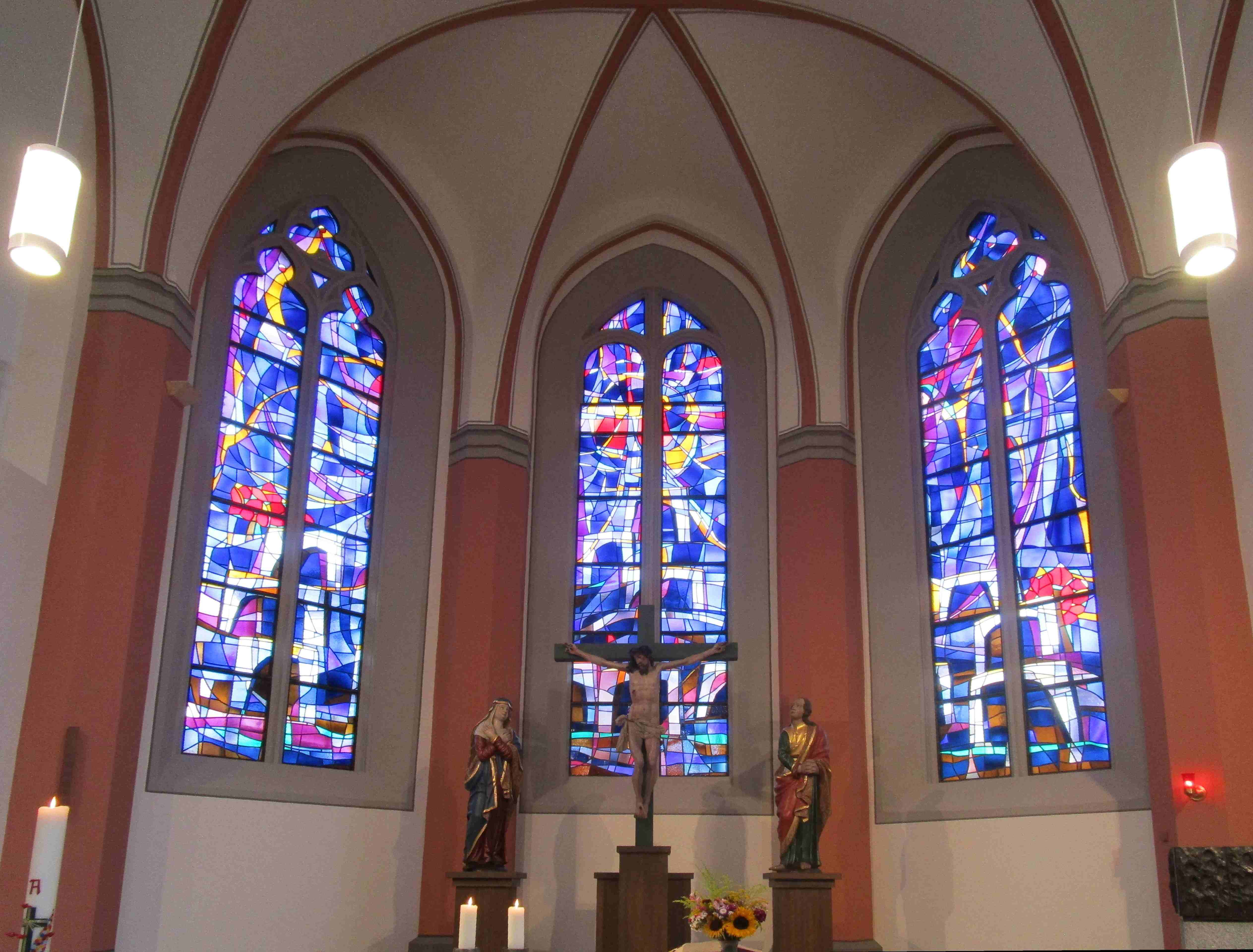 Grundton der Chorfenster ist ein blau-violetter Färbung, die dem Chor eine vornehme Kühle verleiht.