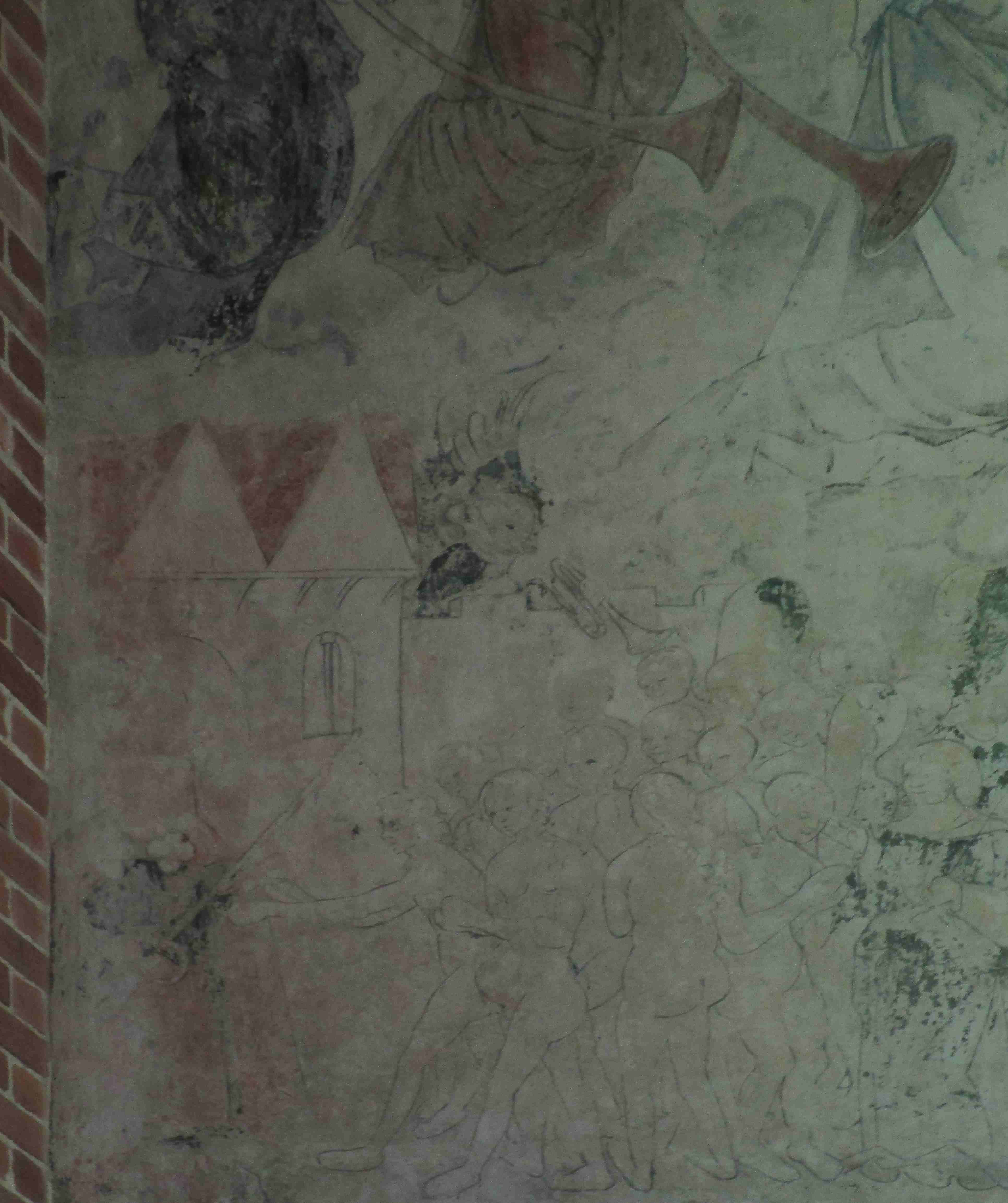 Im Aufbau ist es eines der letzten großformatigen mittelalterlichen Weltgerichte. Man findet es nicht am Triumphbogen, sondern an der linken Wandseite (Osten) vor der Chorschranke. In der Mitte thront Christus auf einem Regenbogen, aus seinem Mund kommen die Symbole Schwert (Gericht) und Lilie (Vergebung). Er ist umgeben von Maria (links) und Johannes dem Täufer (rechts), dann Engeln, die eine mittlere Reihe bilden. Die Malerei über diesen Figuren ist weniger gut erhalten, aber in der Zone darunter haben wir rechts die bereits erwähnte Hölle in Form eines Höllendrachen (typisch für das späte Mittelalter) und rechts das Himmlische Jerusalem, dazwischen Auferstandene, die gerade aus den Gräbern kommen. Jerusalem ist hier ein Gebäude, in dessen Dachzone sich gut zwei parallele Giebel ausmachen lassen. Es sind nicht länger die typischen gotischen Formen, die sich bislang an solchen Darstellungen finden lassen. Rechts muss sich eine Stadtmauer befunden haben, das belegt eine Fragmentinsel mit einer einzelnen Zinne, hinter der Engel musizieren. Der Eingang, also die Himmelspforte, befindet sich hier einmal rechts, außer einem Bogenrest ist alles verloren. In der Pforte befindet sich Petrus mit einem übergroßen Schlüssel, der die ankommenden Nacken in Empfang nimmt.
