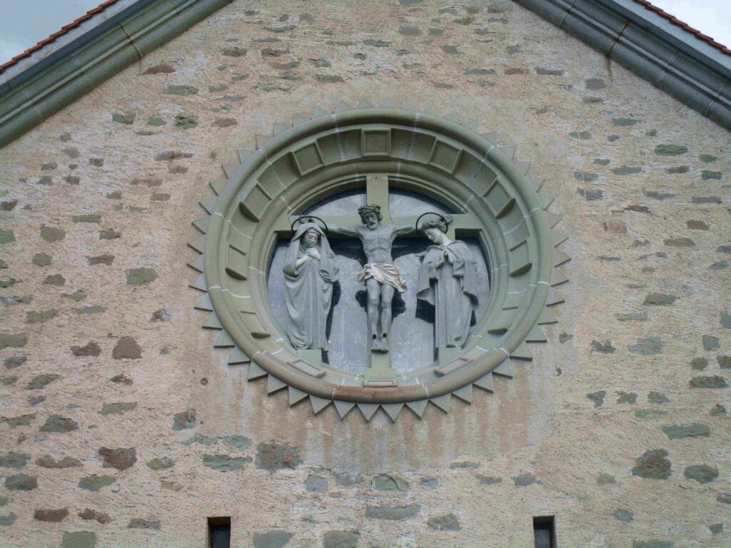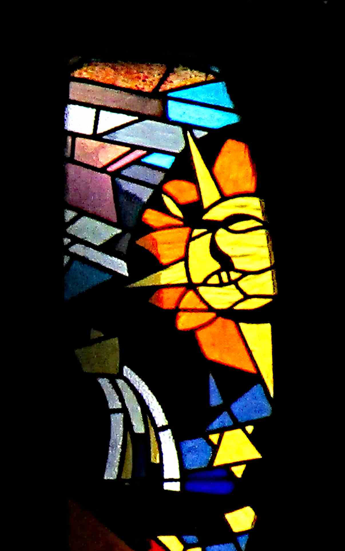 Nur von außen kann man diese Konzeption verstehen. Die Kreuze sind die schattige Rückseite eines steinernen Kruzifixus, das direkt in die Fassung des Fensters eingearbeitet wurde. Zusätzlichen stehen auch zwei Frauen neben dem Kreuz, Maria und Maria Magdalena. Die Strahlen gehen also vom Haupt Christi aus, die dunkleren Stellen der Glasmalerei sind die Schatten der Gewänder dieser Frauen.