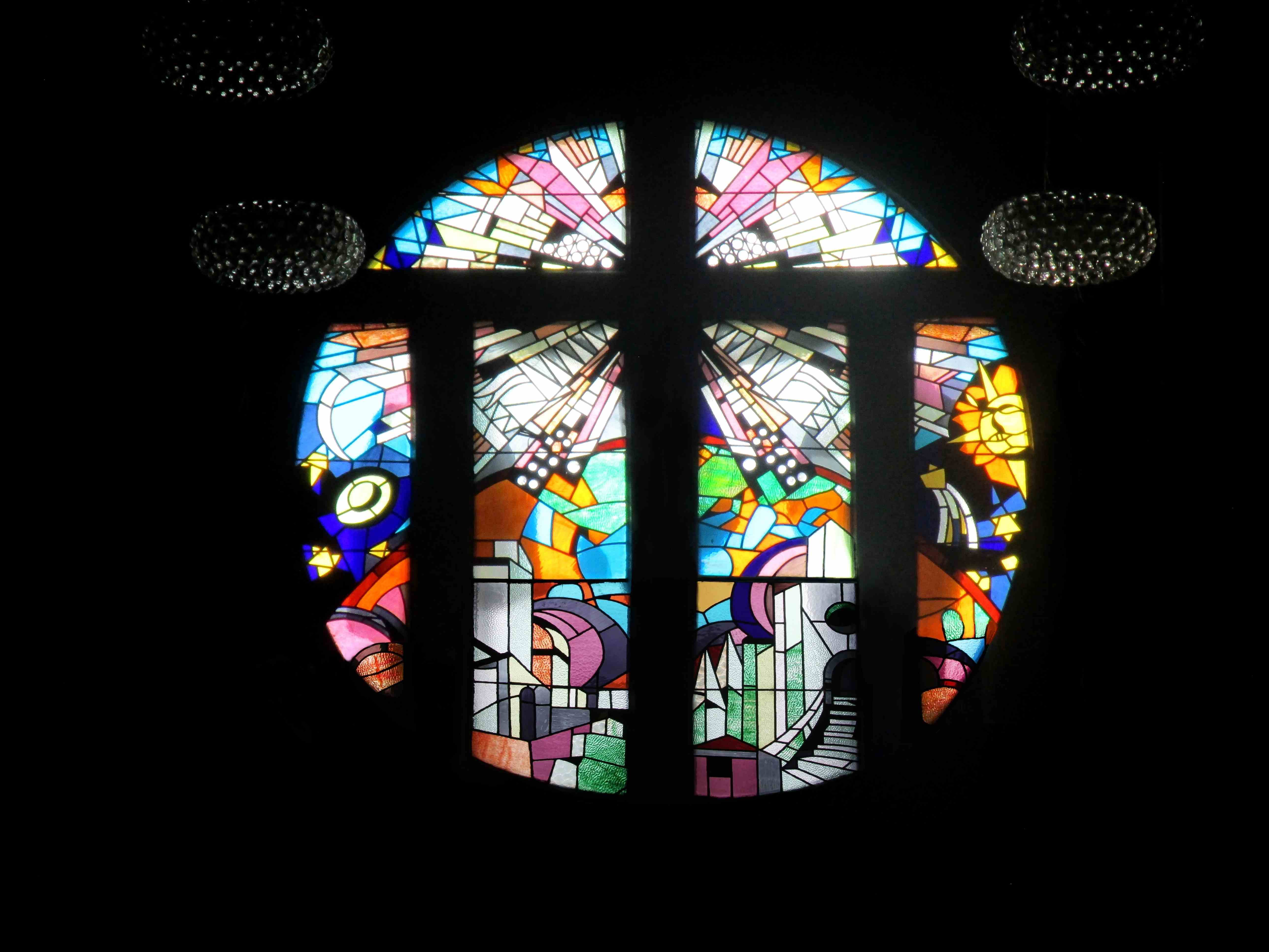 Betrachtet man dieses Rundfenster, gewinnt man anhand der Farben und geschwungen Formen den Eindruck, ein Kunstwerk der 1970er Jahre vor sich zu haben. Tatsächlich ist diese Arbeit zwei Generationen zuvor in den 1920er Jahren entstanden, für eine reformierte Kirche in der französischsprachigen Schweiz, im Ort Echarlens (Kanton Freiburg). Sie ist der Himmelfahrt Mariens gewidmet und trägt den Namen Notre-Dame de l’Assomption.